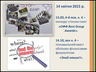 З 14 по 22 квітня 2015 року в інституті проходив Тиждень обліково-фінансового факультету, проведення якого навесні вже четвертий рік поспіль стало гарною традицією. У програмі заходів до дня факультету було заплановано багато цікавинок: квести, майстер-класи, різноманітні конкурси, круглі столи, соціальні акції та багато-багато іншого.