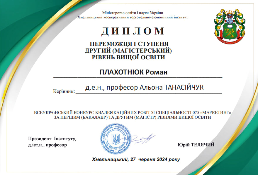 Вітаємо наших талановитих магістрів-випускників та їхніх наукових керівників з перемогою: – Плахотнюк Роман (випускник спеціальності 075 «Маркетинг» ОП «Маркетинг» другого (магістерського) рівня вищої освіти) отримав диплом переможця І ступеня, науковий керівник Танасійчук Альона, доктор економічних наук, професор, професор кафедри маркетингу та реклами;