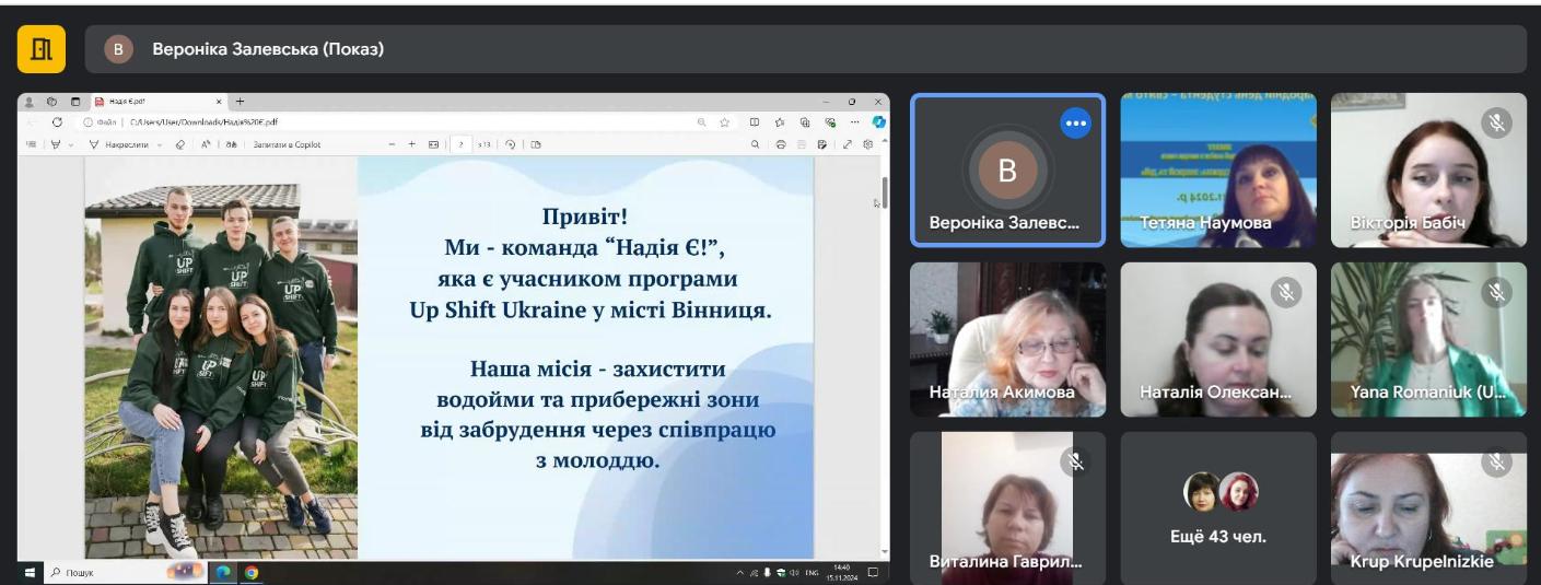На святкуванні студенти з усіх куточків України ділилися своїми здобутками, захопленнями, подорожами, заходами, які проводять або беруть участь, вітали з Днем студента. Вероніка Залевська (ОБО-21д) розповіла про екологічну діяльність команди «Надія Є», яка є учасником Програми Up Shift Ukraine у місті Вінниці. Розказала як вони створили команду, як організовували просвітницьку роботу з питань екології, брали участь у толоках з очищення навколишнього середовища, тощо. Обмін досвідом серед здобувачів різних навчальних закладів проходив у щирій, затишній атмосфері.