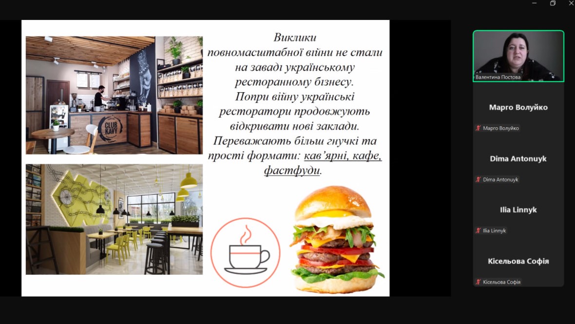 Під час заходу учні ознайомилися з актуальними тенденціями ресторанного бізнесу: інноваційними підходами до формування меню, дизайну інтер’єру та маркетинговими стратегіями, які допомагають закладам харчування залишатися конкурентоспроможними. Доцент кафедри туризму та готельно-ресторанної справи Постова Валентина детально розповіла, як сучасні тренди впливають на розвиток ресторанної індустрії як у місті Вінниця, так і в Україні загалом.