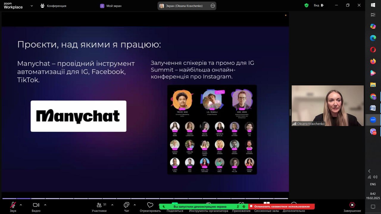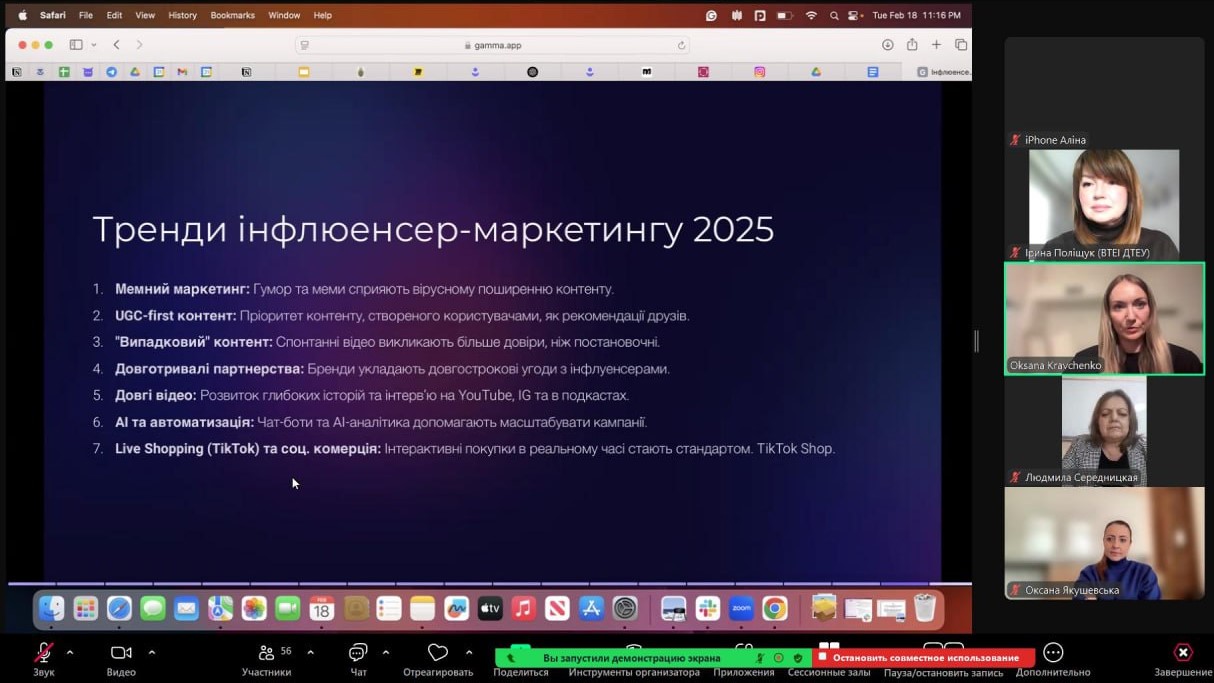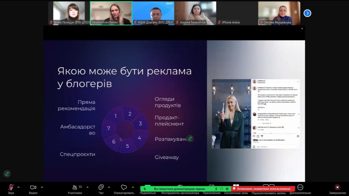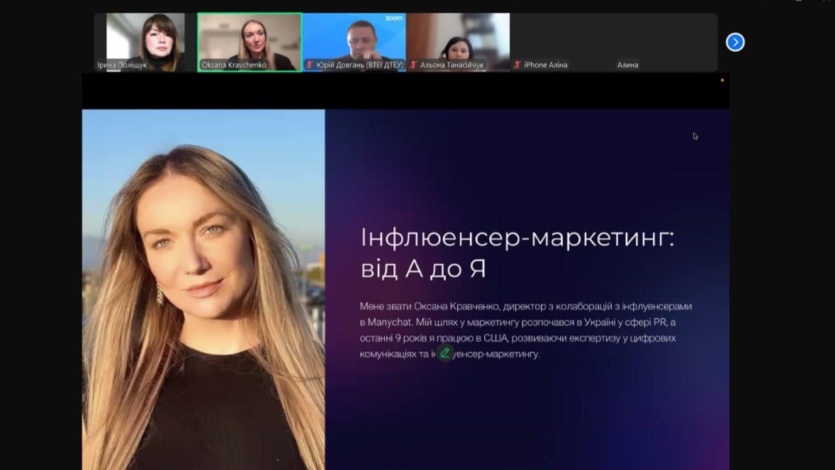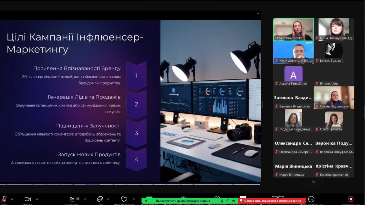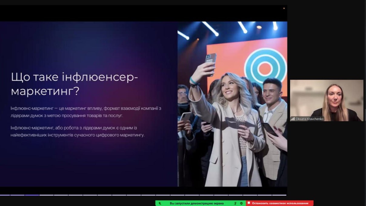 Під час онлайн-лекції пані Оксана розповіла, як інфлюенсери змінюють сучасний маркетинг і чому бренди все більше довіряють лідерам думок. Вона пояснила, як контент еволюціонував від звичайних відео до інтерактивного досвіду та чому особиста взаємодія з аудиторією є ключовою. Було представлено статистику зростання інвестицій у дану сферу та аналіз ефективності таких кампаній. Окремо обговорювалися чинники довіри до блогерів і те, чому споживачі більше вірять особистим рекомендаціям, ніж традиційній рекламі.