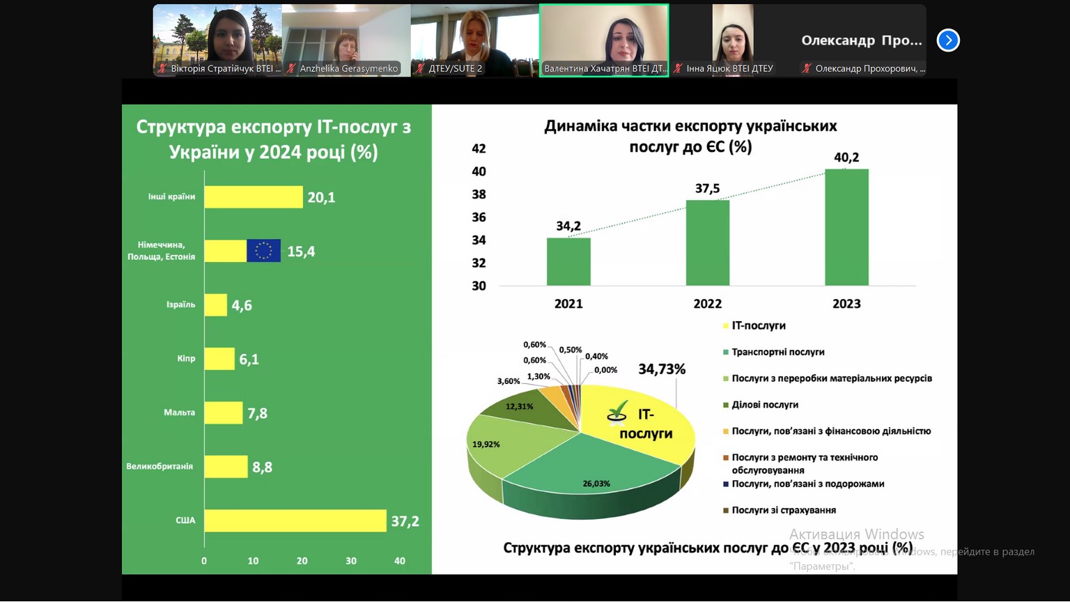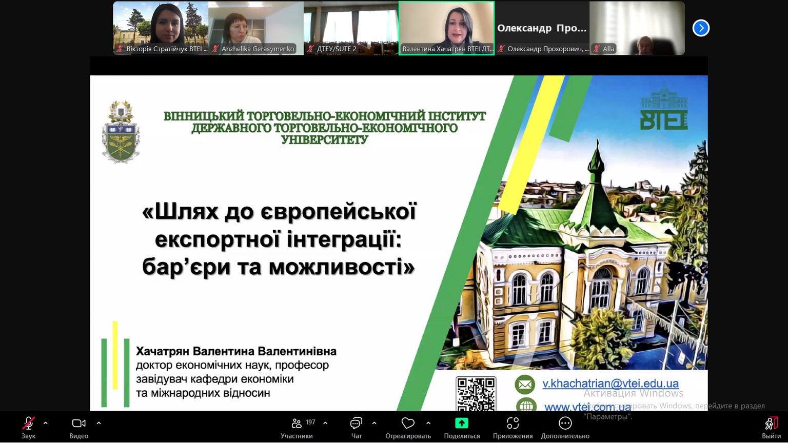 В процесі обговорення сучасних геополітичних викликів, що постали перед економіками ЄС та України і шляхів їх врегулювання завідувач кафедри економіки та міжнародних відносин Валентина Хачатрян виступила із доповіддю «Шлях до європейської експортної інтеграції: бар’єри та можливості», в якій акцентувала увагу на експортних можливостях України, що забезпечують подолання існуючих бар’єрів в умовах активізації інноваційного розвитку українських компаній для успішного їх виходу на ринок ЄС.