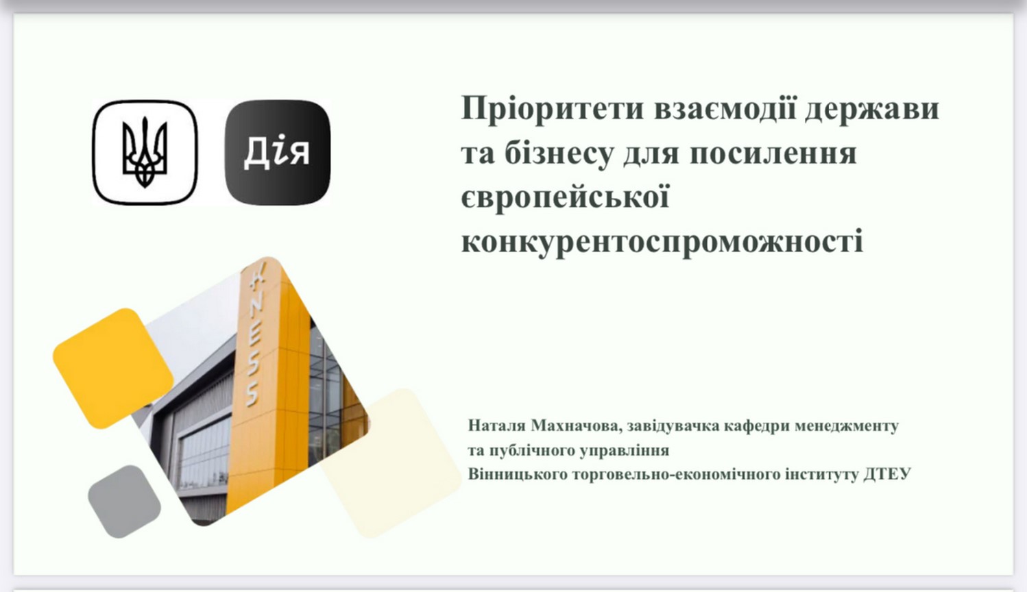 Завідувач кафедри менеджменту та публічного управління Наталя Махначова презентувала доповідь на тему «Пріоритети взаємодії держави та бізнесу для посилення європейської конкурентоспроможності». Зосередила увагу на потребі спрощення регуляторного середовища в ЄС, застосування цифрового дизайну в законодавстві ЄС та інструментів штучного інтелекту. Зауважила, що пріоритетом взаємодії є інтеграція цілей сталого розвитку в бізнес-стратегії підприємств.