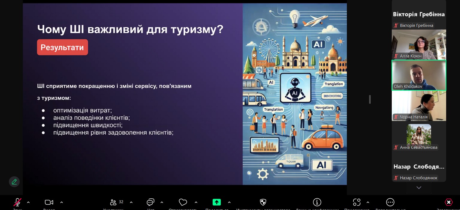 Ходаков Олег, здобувач вищої освіти ОС «магістр» ОП «Міжнародний туристичний бізнес» групи МТБ-11д(м) з доповіддю «ШІ в туризмі: позитивні та негативні сторони»;