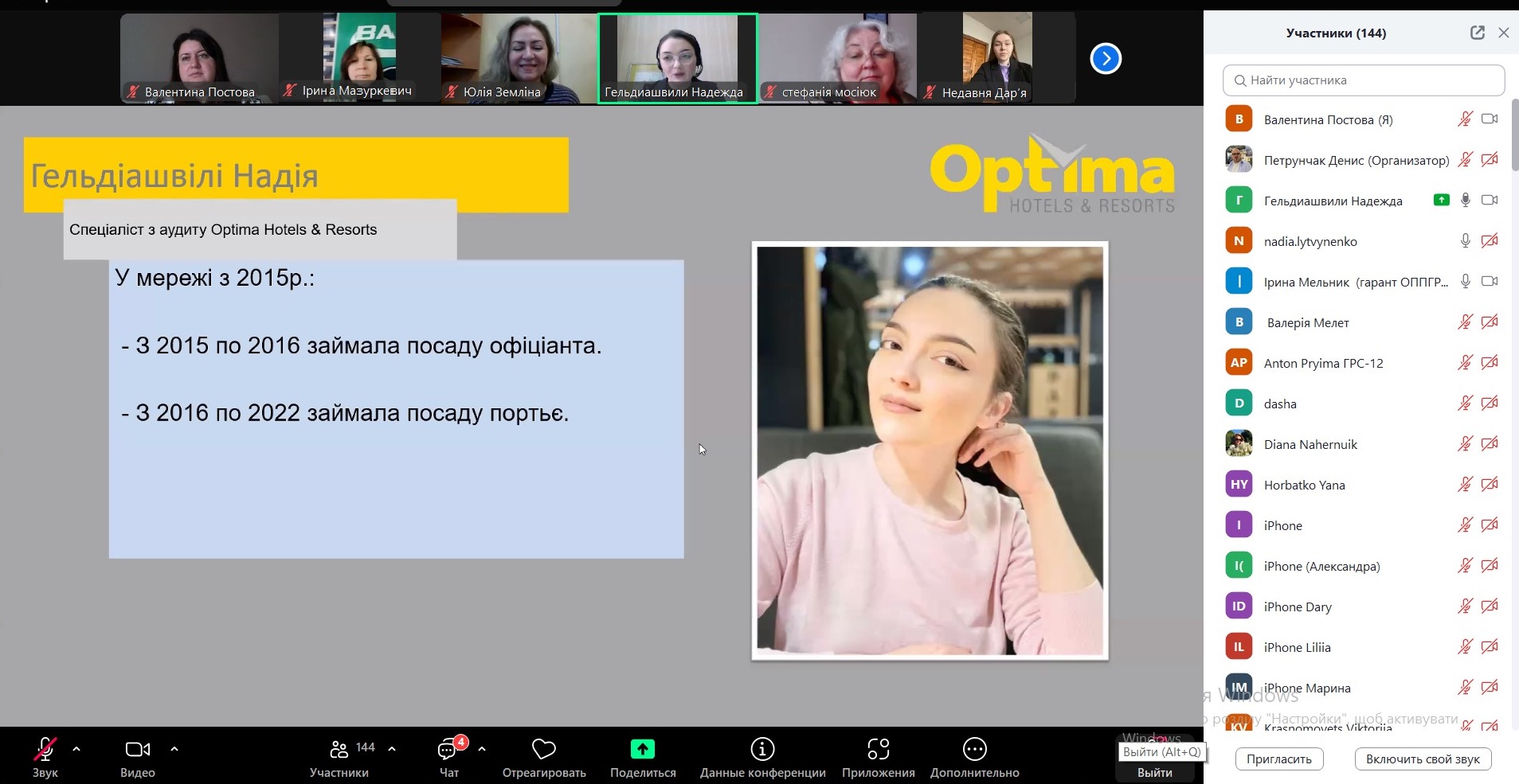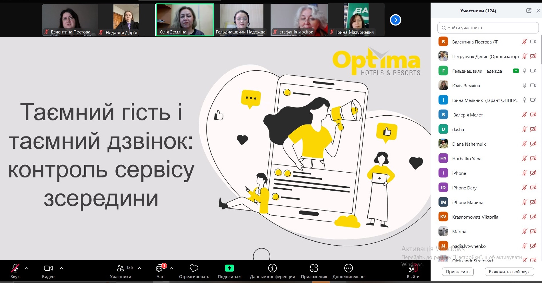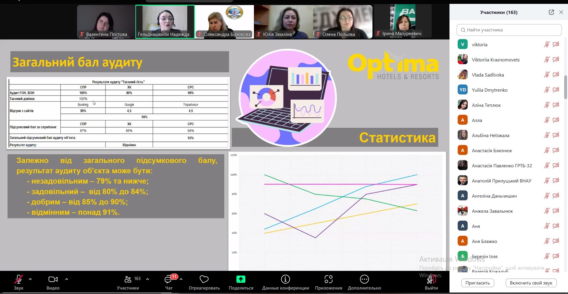 25 березня 2025 року науково-педагогічні працівники кафедри туризму та готельно-ресторанної справи та здобувачі вищої освіти за спеціальністю 241 «Готельно-ресторанна справа» прослухали гостьову лекцію на тему «Таємний гість і таємний дзвінок: контроль сервісу зсередини». Спікером лекції була Надія Гельдіашвілі – визнаний експерт, спеціаліст з аудиту «Optima Hotels & Resorts», яка поділилася своїми глибокими знаннями та багаторічним практичним досвідом у сфері оцінки якості готельного сервісу.