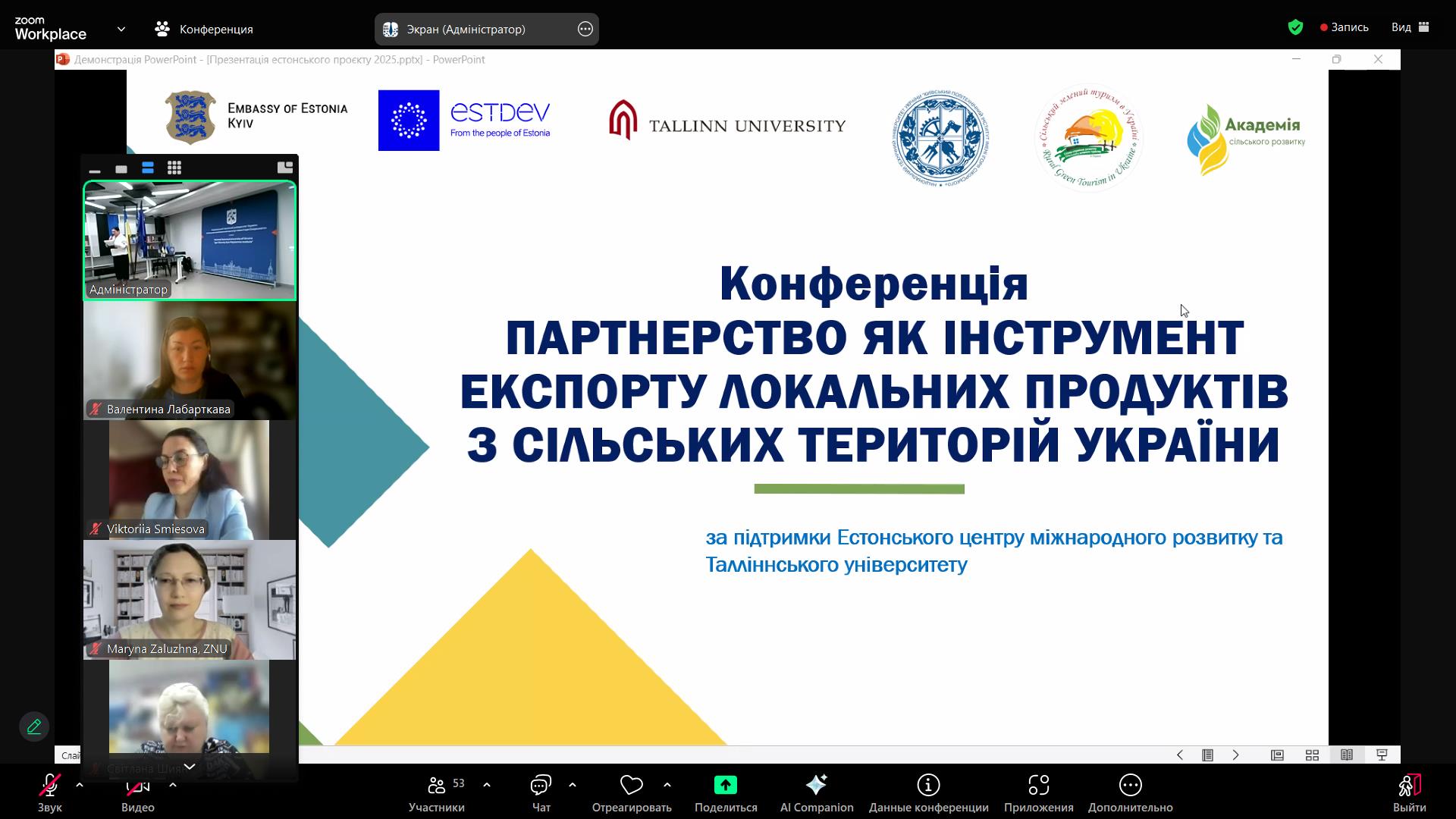28 квітня 2025 року науково-педагогічні працівники кафедри туризму та готельно-ресторанної справи взяли участь у конференції «Партнерство як інструмент експорту локальних продуктів з сільських територій України», яка відбулася за підсумками виконання міжнародного проєкту «Створення культури партнерства та розвиток спільних місцевих продуктів для підвищення експортної спроможності малого бізнесу на прифронтових та прикордонних сільських територіях» за фінансової підтримки Естонського центру міжнародного розвитку.