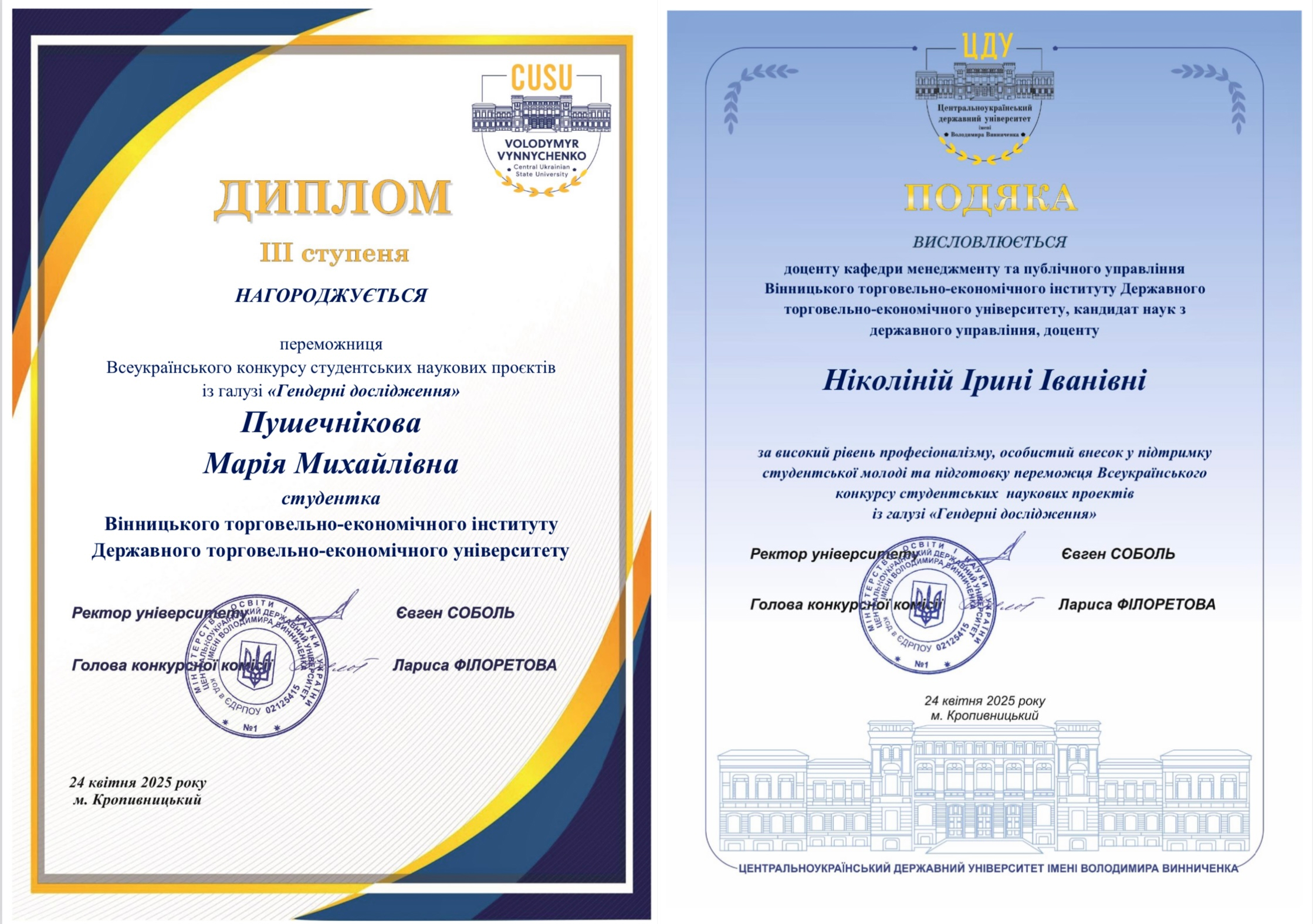 24 квітня 2025 року відбувся захист наукових проєктів на підсумковій науково-практичній конференції в рамках Всеукраїнського конкурсу студентських наукових проєктів із галузі «Гендерні дослідження» серед студентів закладів вищої освіти України на базі Центральноукраїнського державного університету імені Володимира Винниченка.