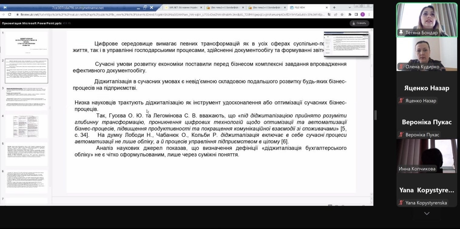 8 травня 2025 року на базі кафедри обліку та оподаткування проведено лекцію on-line кандидатом економічних наук, доцентом, головним бухгалтером ПП «Довіра» Бондар Тетяною на тему: «Діджиталізація бухгалтерського обліку».