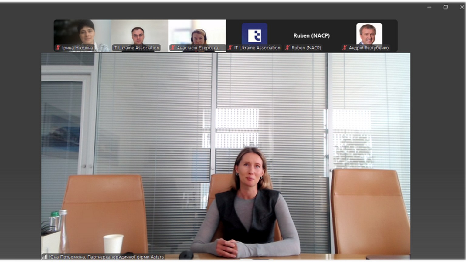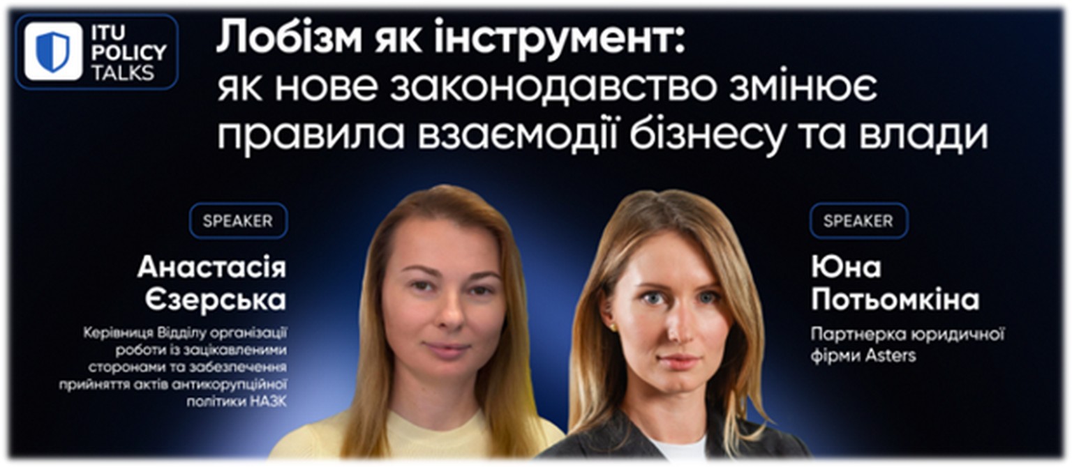 Спікерами зустрічі стали Анастасія Єзерська – керівниця Відділу організації роботи із зацікавленими сторонами та забезпечення прийняття актів антикорупційної політики НАЗК; Юна Потьомкіна – партнерка юридичної фірми ITU Partner Asters, керівниця практики альтернативного вирішення спорів та співкерівниця практики публічної адвокації та законотворчості.