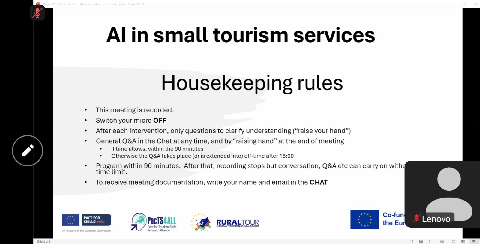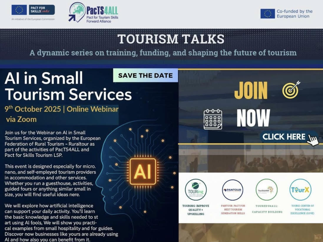 9 жовтня 2025 року науково-педагогічні працівники кафедри туризму та готельно-ресторанної справи, здобувачі вищої освіти за спеціальностями J3 Туризм і рекреація, J2 Готельно-ресторанна справа та кейтеринг взяли участь в онлайн-вебінарі «ШІ в туристичних послугах», організованому Європейською федерацією сільського туризму Ruraltour у межах ініціатив PacTS4ALL та Pact for Skills Tourism LSP та розробленому для мікро-, нано- та само зайнятих провайдерів туристичних послуг у сфері розміщення та суміжних із ними.