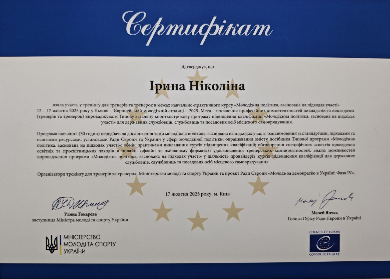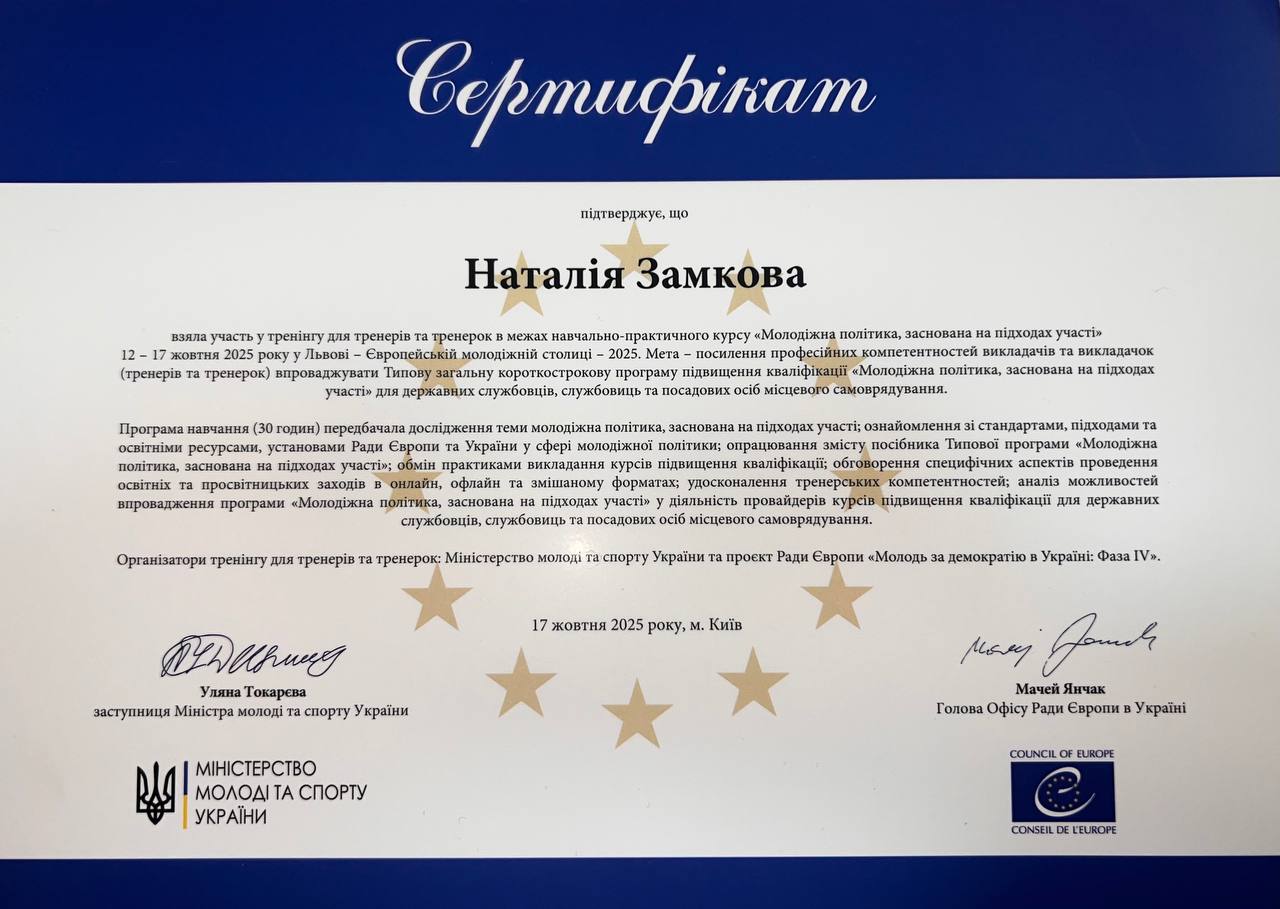 З 12 по 17 жовтня 2025 року у Львові доктор філософських наук, професор Наталія Замкова та кандидат наук з державного управління, доцент Ірина Ніколіна пройшли навчання в межах другого навчально-практичного курсу «Молодіжна політика, заснована на підходах участі» - проєкті Ради Європи у співпраці з Міністерством молоді та спорту України «Молодь за демократію в Україні: Фаза IV».