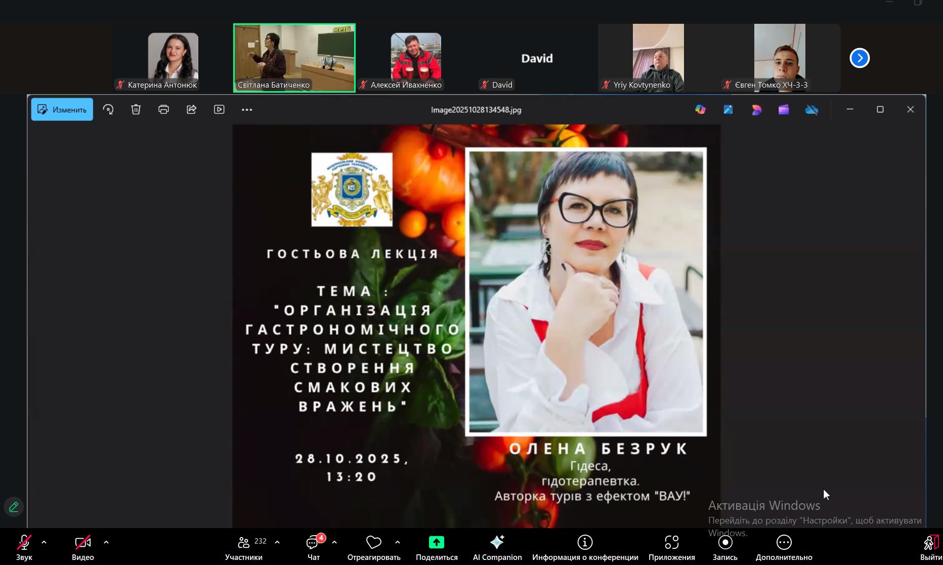 28 жовтня 2025 року науково-педагогічні працівники кафедри туризму та готельно-ресторанної справи, здобувачі вищої освіти за спеціальністю J3 Туризм та рекреація доєдналися до гостьової лекції на тему «Організація гастрономічного туру: мистецтво смакових вражень». У якості спікера на лекції виступила гідеса, гідотерапевтка, авторка турів з ефектом «ВАУ!» Олена Безрук.