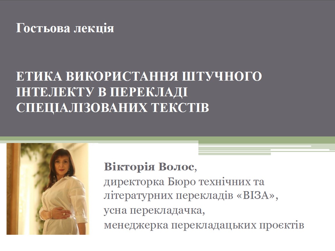 Гостьова лекція «Етика використання штучного інтелекту у перекладі спеціалізованих текстів» від Вікторії Волос