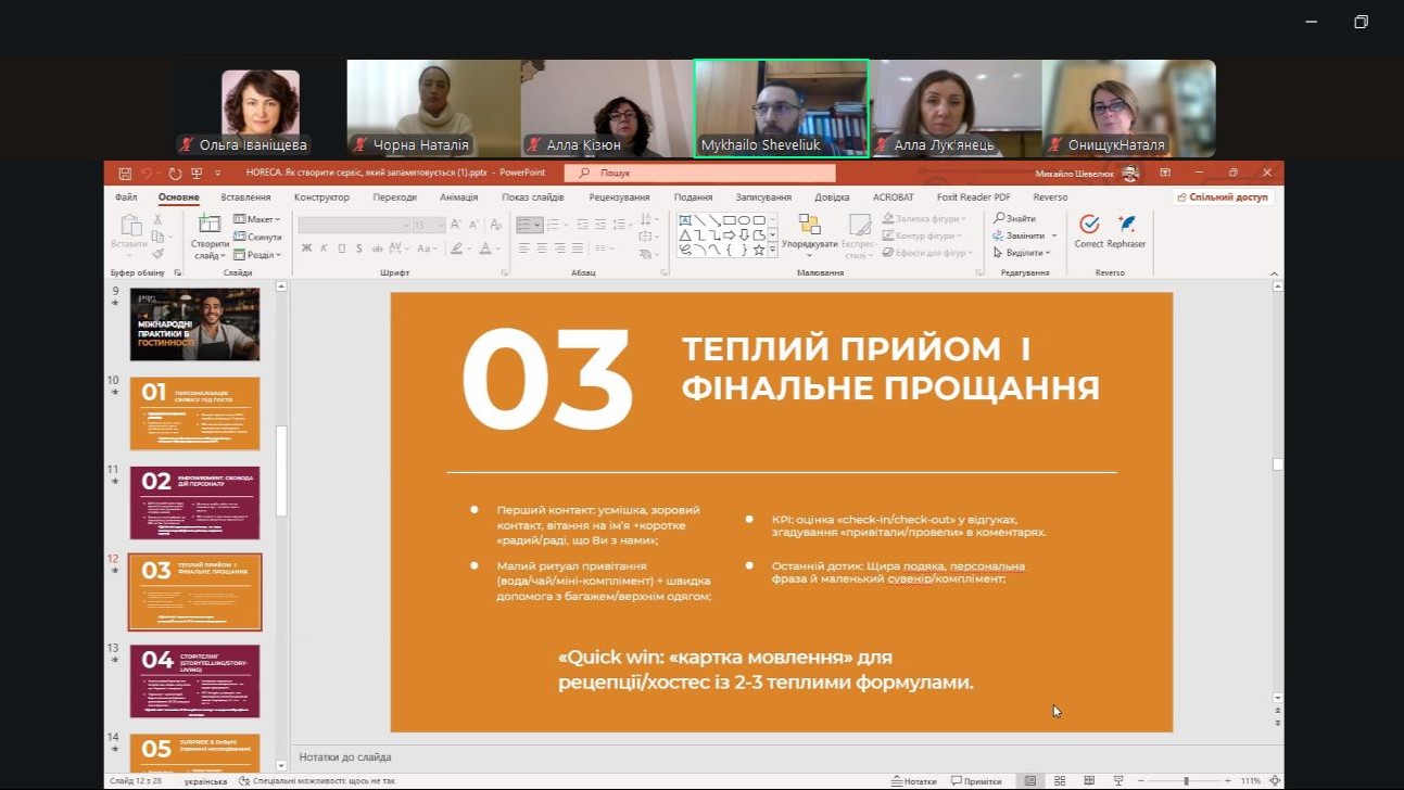 04 листопада 2025 року в інституті відбулася гостьова лекція на тему «Як створити сервіс, який запам’ятовується з першого погляду», яку на запрошення кафедри туризму та готельно-ресторанної справи для здобувачів вищої освіти за спеціальностями J2 Готельно-ресторанна справа та кейтеринг, J3 Туризм та рекреація, G13 Харчові технології провів Михайло Шевелюк – засновник та керівник Школи гостинності Ukrainian Horeca School, експерт з сервісу та гостинності, менеджер з розвитку готелю «Швейцарський» та ресторану «Валентино» (м. Львів), доктор філософії з культурології, викладач кафедри готельно-ресторанного бізнесу Львівського державного університету фізичної культури імені Івана Боберського.
