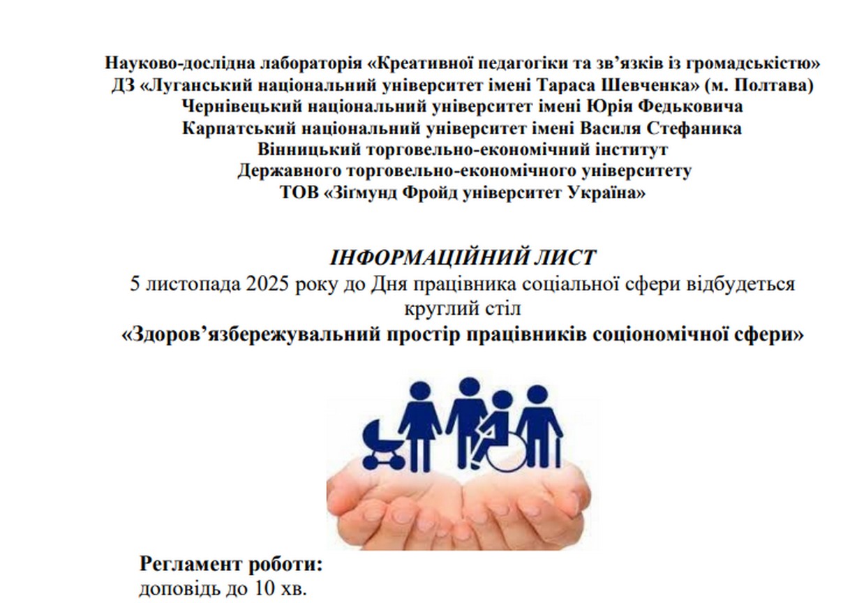 5 листопада 2025 року здобувачі вищої освіти та викладачі кафедри психології взяли участь у роботі круглого столу «Здоров’язбережувальний простір працівників соціальної сфери», організованого науково-дослідною лабораторією «Креативної педагогіки та зв'язків із громадськістю» спільно з партнерами — провідними університетами України, зокрема Луганським національним університетом імені Тараса Шевченка (м. Полтава), Чернівецьким національним університетом імені Юрія Федьковича, Карпатським національним університетом імені Василя Стефаника, Вінницьким торговельно-економічним інститутом Державного торговельно-економічного університету та ТОВ «Університето Зігмунда Фройда Україна».