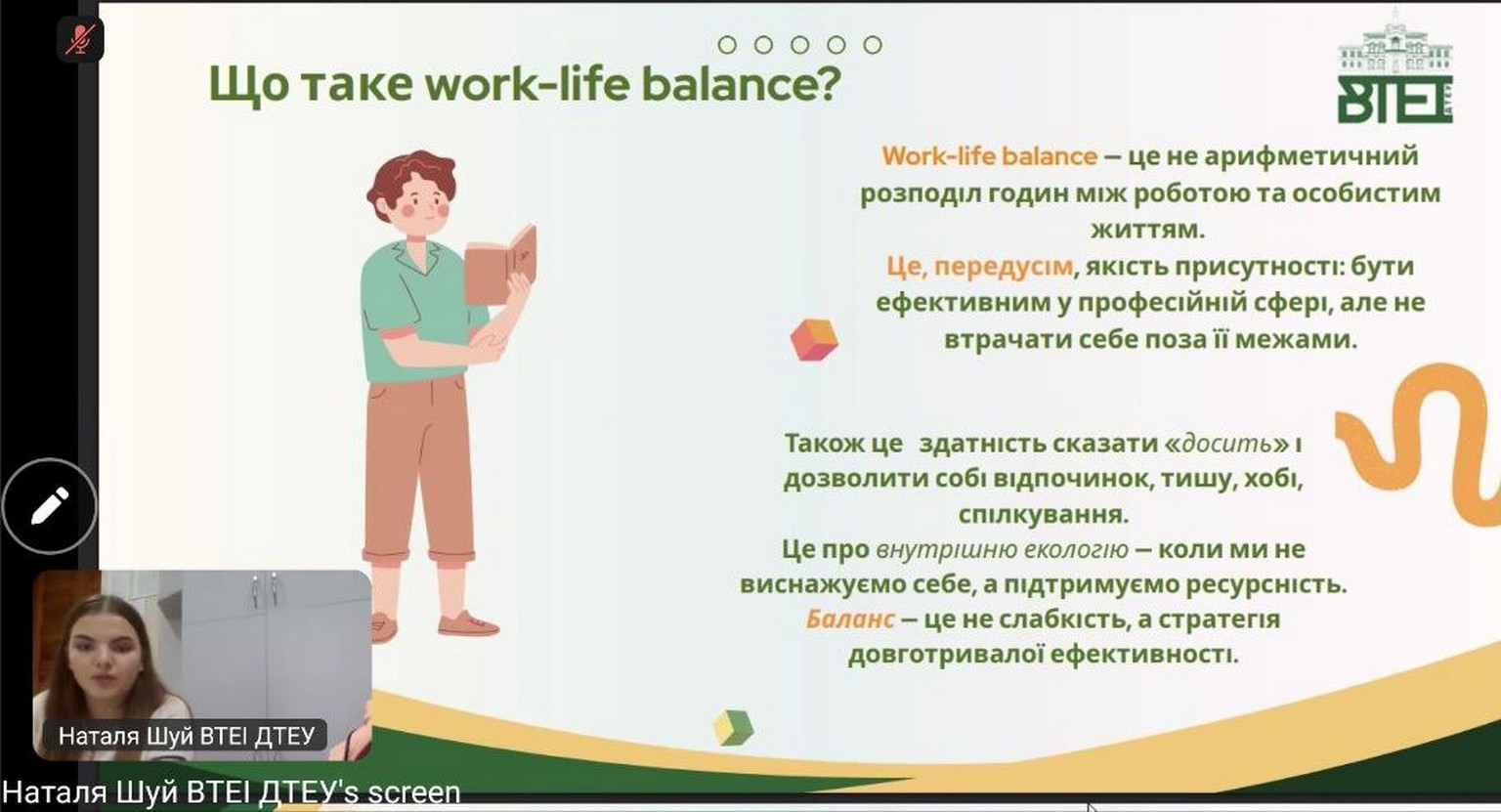 В рамках роботи круглого столу свої наукові здобутки представила здобувачка першого (бакалаврського) рівня вищої освіти спеціальності «Психологія», освітньої програми «Економічна та соціальна психологія» з виступом на тему «Work-life balance як елемент здоров'язбережувальної культури». Формат зустрічі — Five o'clock Tea — створив дружню атмосферу спілкування, сприяв відкритому діалогу та творчим дискусіям.