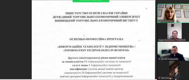 В ході проведення засідання робочої групи до відома зовнішніх стейкголдерів було донесено інформацію щодо реструктуризації підрозділів Вінницького торговельно-економічного інституту ДТЕУ та утворення кафедри інноваційної економіки та цифрових технологій, на базі якої буде здійснюватись підготовка здобувачів за освітньою програмою «Інформаційні технології у підприємництві». Також обговорювались питання щодо оновлення освітніх компонент відповідно до потреб сучасного конкурентного середовища.