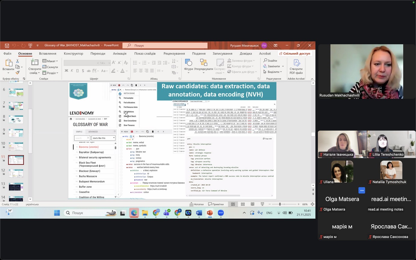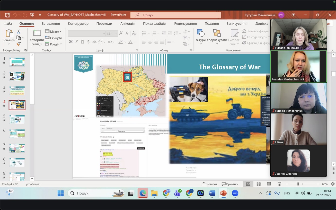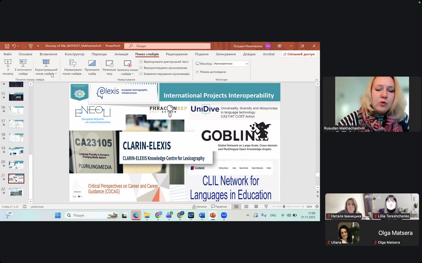 Під час зустрічі лекторка детально представила, які кроки вже здійснено для укладання словника, який фіксує мовні реалії війни, нові лексеми, метафоричні моделі, емоційно марковані одиниці та зміни значень у публічному дискурсі.