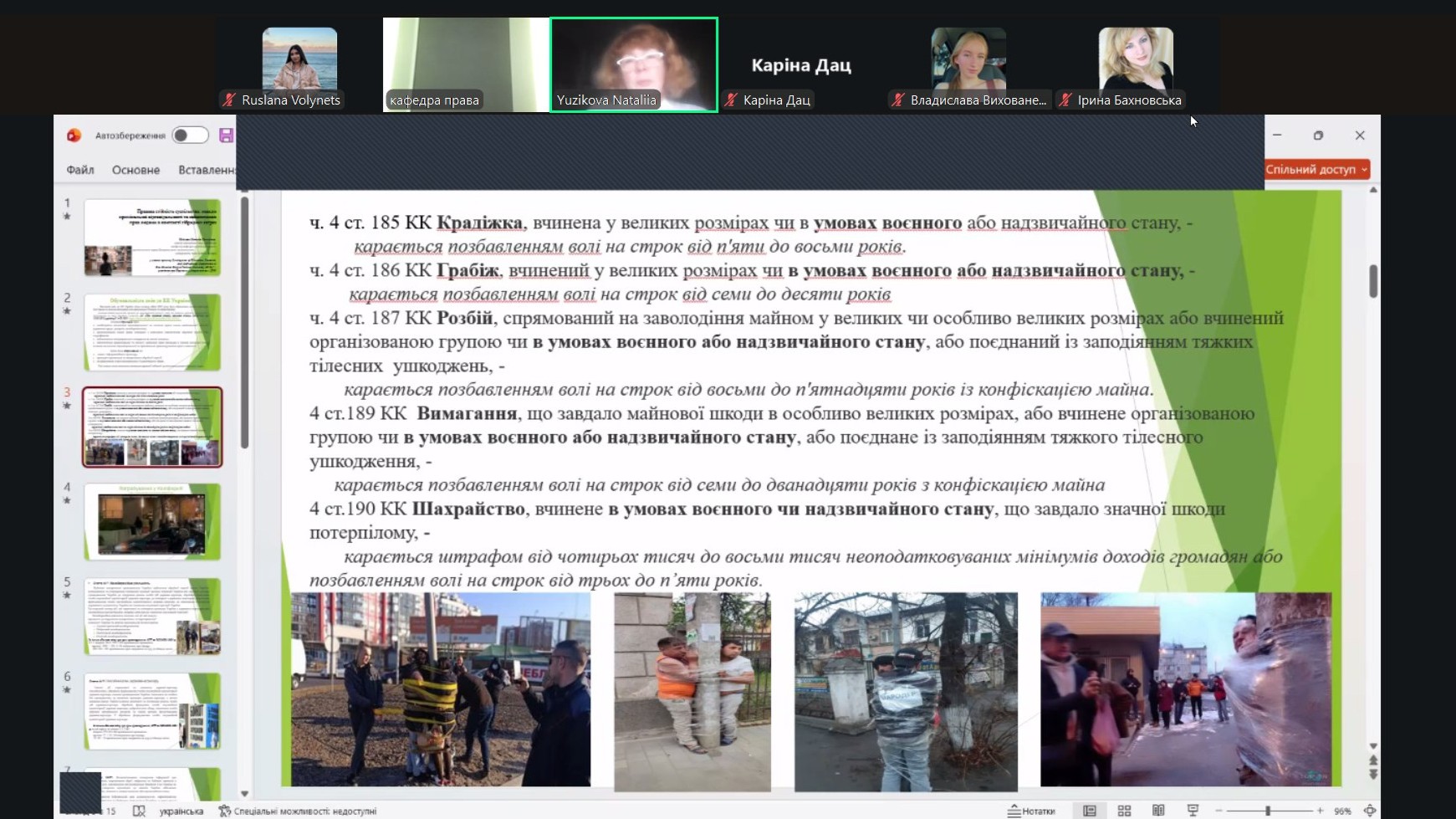 26 листопада 2025 року відбулася гостьова лекція за участю професора, доктора юридичних наук, професора кафедри адміністративного і кримінального права Дніпропетровського національного університету ім. Олеся Гончара, провідного українського фахівця у галузі кримінального права, кримінології та міжнародних стандартів правосуддя і гармонізації національного законодавства з європейськими стандартами верховенства права Юзікової Наталії Семенівни.