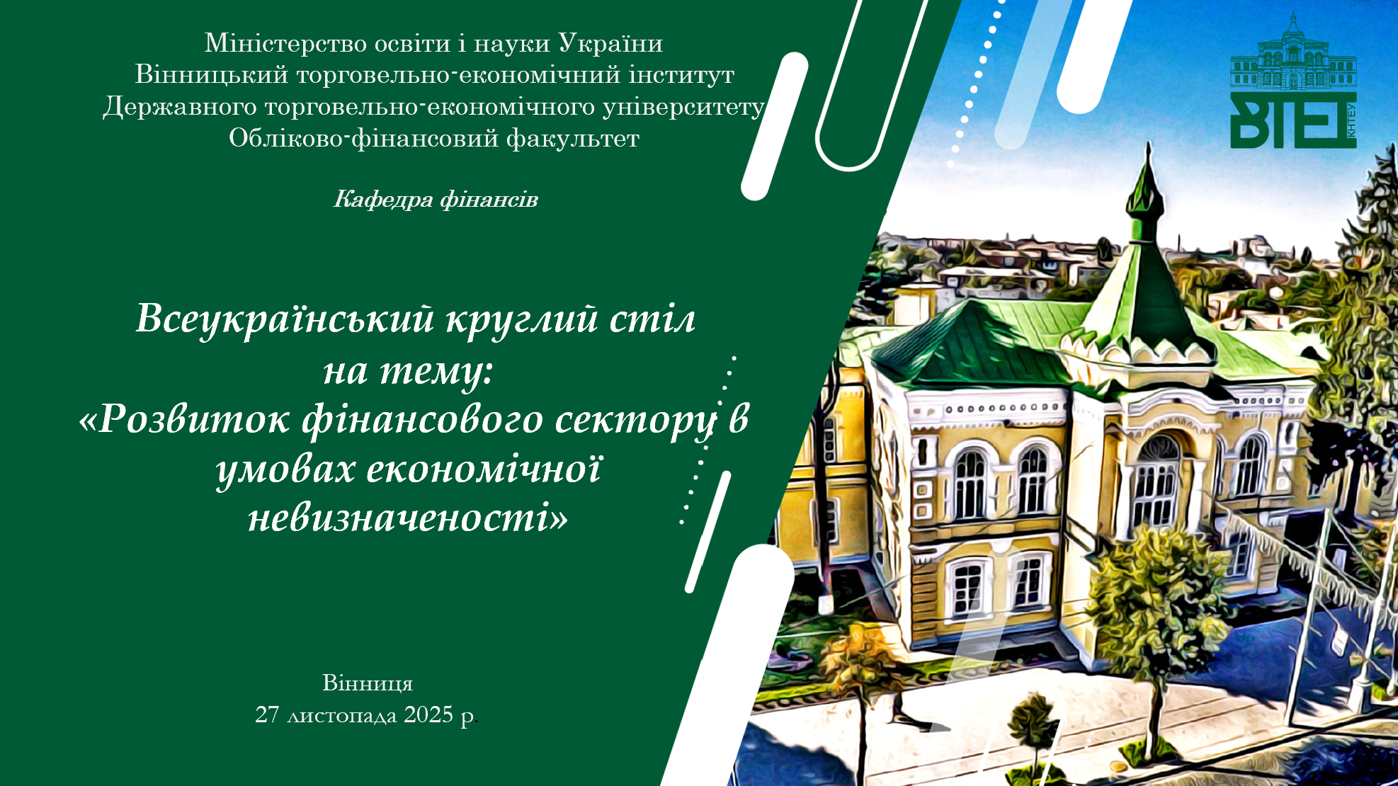 27 листопада 2025 року відбувся Всеукраїнський круглий стіл «Розвиток фінансового сектору в умовах економічної невизначеності», організований кафедрою фінансів ВТЕІ ДТЕУ. Захід об’єднав науковців, практиків фінансової сфери та студентську молодь з метою комплексного аналізу сучасних викликів і пошуку стратегій забезпечення стійкості фінансової системи України в умовах тривалої турбулентності.