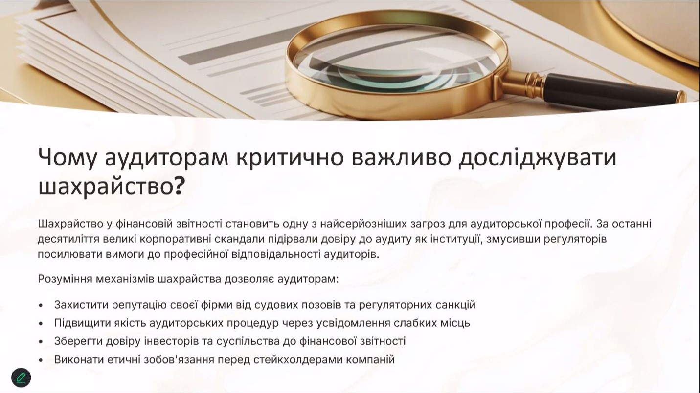 Під час заходу були розглянуті актуальні питання ідентифікації та оцінювання ризиків шахрайства в аудиторській діяльності, практичні підходи до їх мінімізації, а також роль професійного судження аудитора в умовах підвищених ризиків та цифровізації бізнес-процесів.