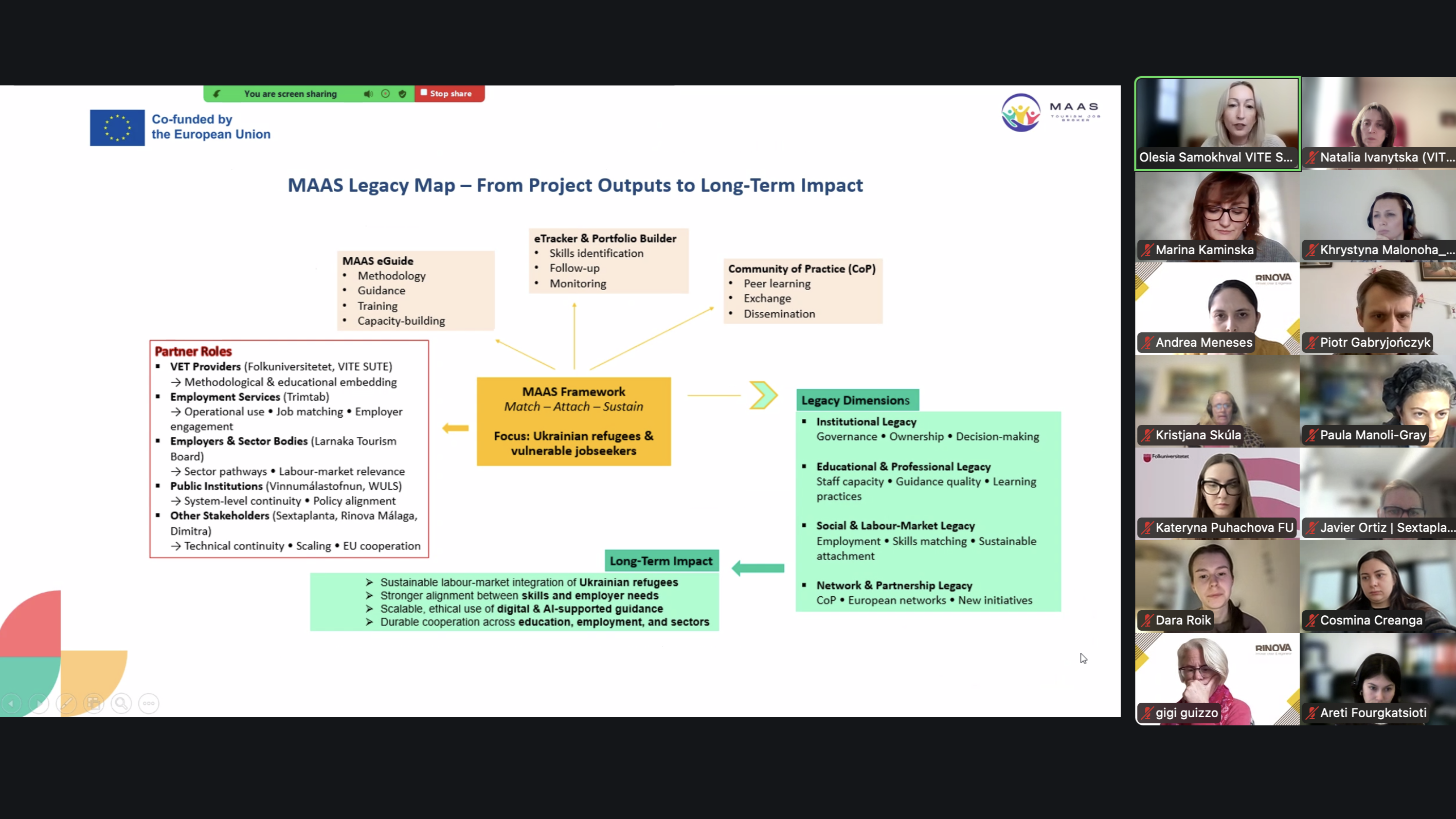 Основною темою заходу стало формування плану використання результатів проєкту MAAS після його завершення у організаційній роботі партнерів, зокрема через інтеграцію інструментів MAAS у постійні сервіси, стратегії та навчальні практики установ. Під час зустрічі обговорювалися стратегія експлуатації результатів проєкту, зокрема загальні дії партнерів, канали поширення, адаптація для інших цільових груп; Legacy Framework – модель спадщини проєкту MAAS, яка охоплює інституційний, освітній, професійний та соціальний рівні; підписання Меморандумів про взаєморозуміння (MoU) та Листів підтримки, що засвідчують довгострокову відданість партнерів подальшому впровадженню напрацювань проєкту. Зустріч продемонструвала готовність партнерів до системного впровадження результатів проєкту MAAS у власну діяльність, зокрема в освітню, консультаційну та соціальну підтримку вразливих груп населення. Проєкт MAAS фінансується Європейським Союзом.
