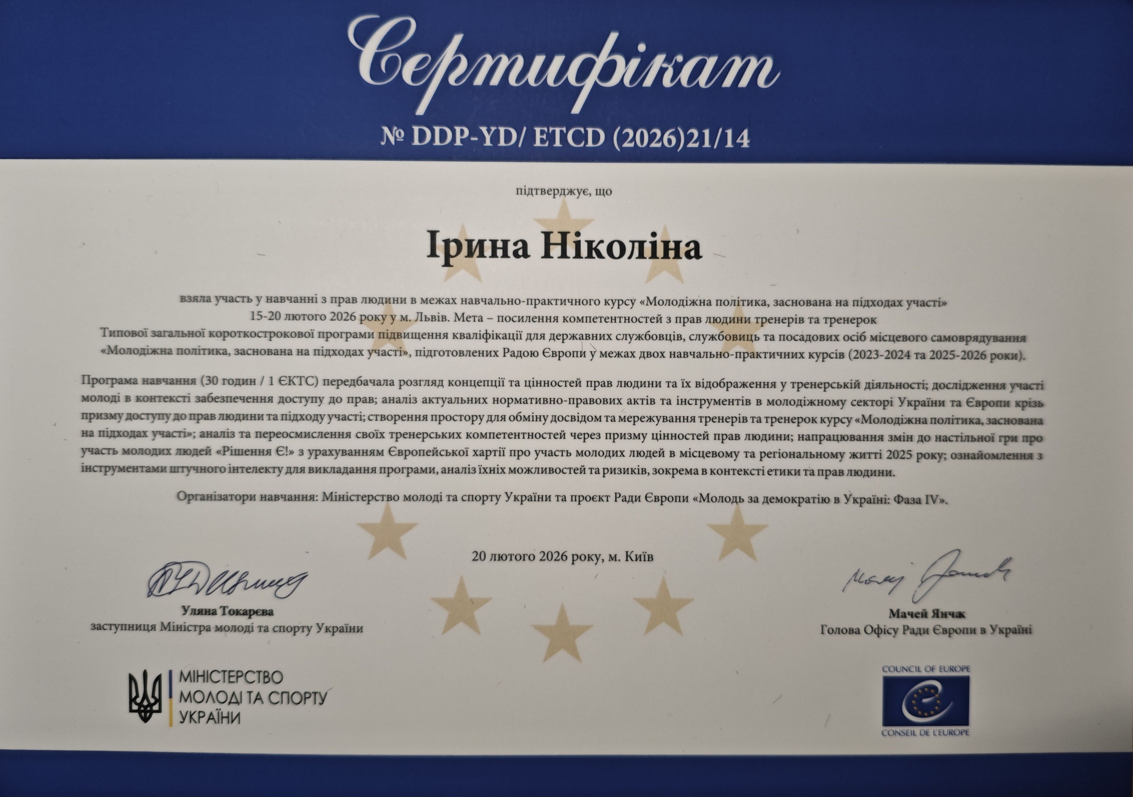 Впродовж 15–20 лютого 2026 року кандидат наук з державного управління, доцент Ірина Ніколіна взяла участь у навчально-практичному курсі «Молодіжна політика, заснована на підходах участі», що відбувся у місті Львів.
