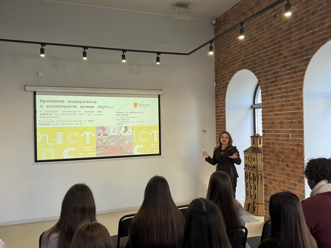 Перед здобувачами вищої освіти виступила директорка підприємства Тетяна Маєвська. Вона розповіла про основні напрями роботи підприємства, заходи та активності, що ним реалізуються задля популяризації туристичної дестинації м. Вінниці. Значну увагу було приділено екскурсійній діяльності підприємства, яка реалізується на високому рівні та викликає інтерес і в вінничан, і в приїжджих. Велику зацікавленість викликала діяльність підприємства щодо організації конференц-сервісу, насамперед в розрізі обслуговування зарубіжних делегацій високого рівня.