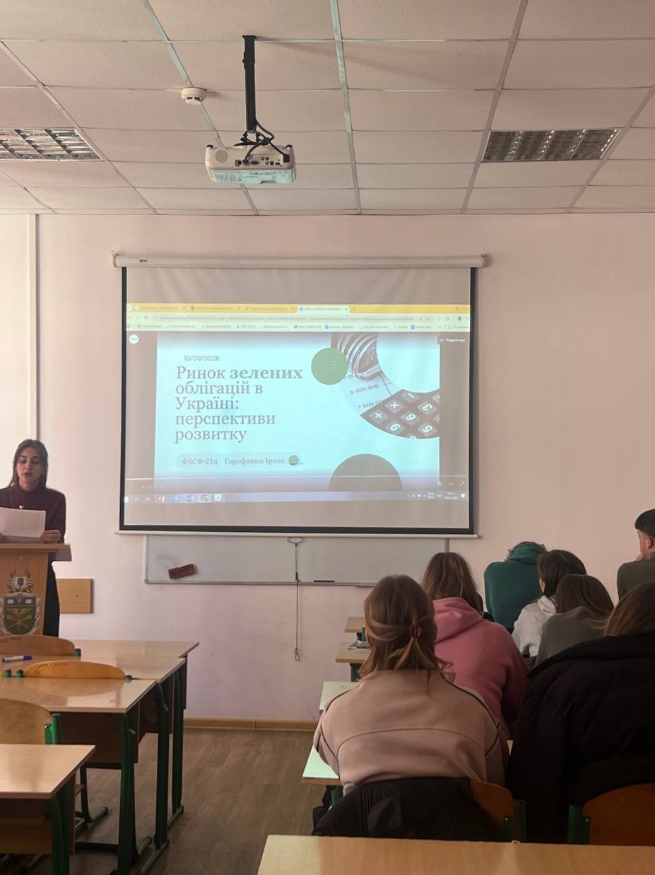 10 березня 2026 року в рамках XІV Фестивалю студентської науки кафедрою фінансів було проведено відкрите засідання наукового гуртка «Сучасна фінансова політика України: проблеми та перспективи» на тему «ESG-фінанси та зелені інвестиції: нові тренди у фінансовій політиці України».
