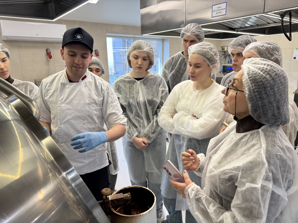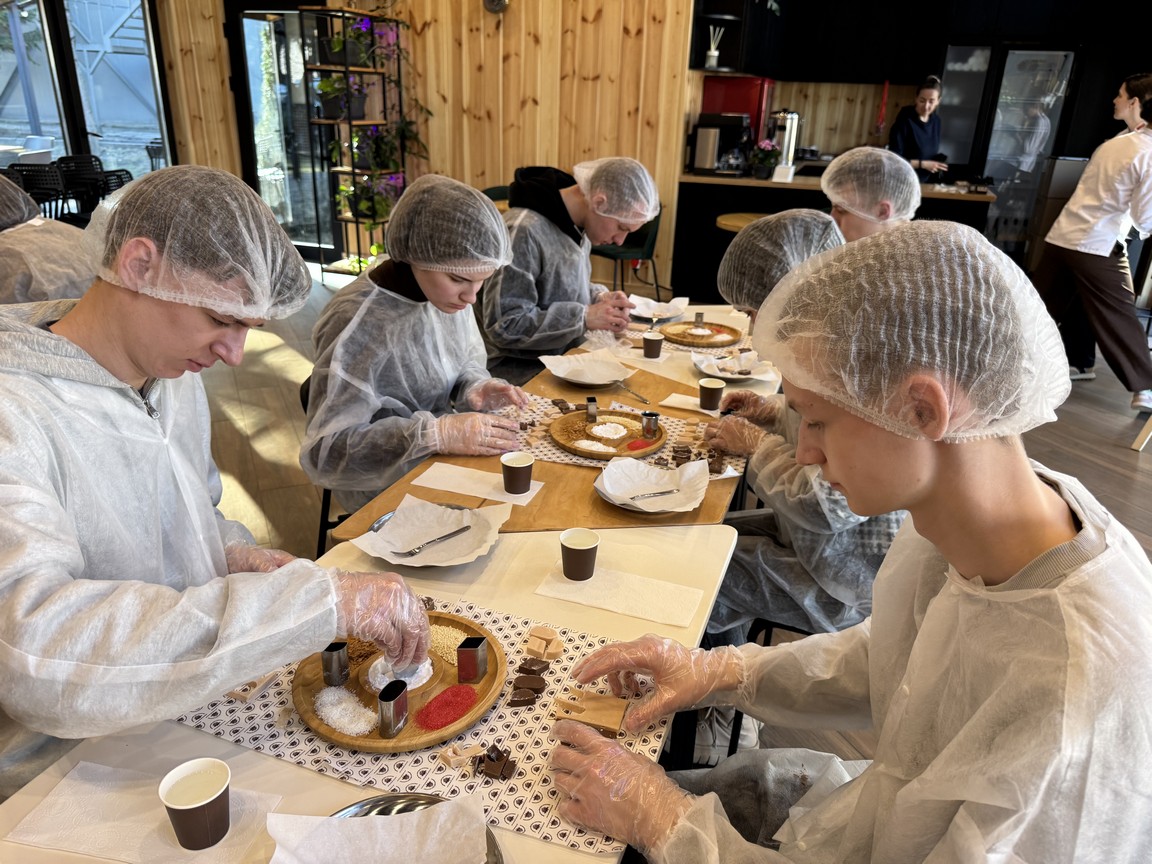 Друга частина відвідування підприємства була представлена майстер-класом, в ході якого здобувачі вищої освіти під керівництвом досвідчених фахівців випробували себе в якості шоколотьє – навчилися розрізняти види шоколаду, працювати з професійним кондитерським інвентарем та створювати власні десерти.