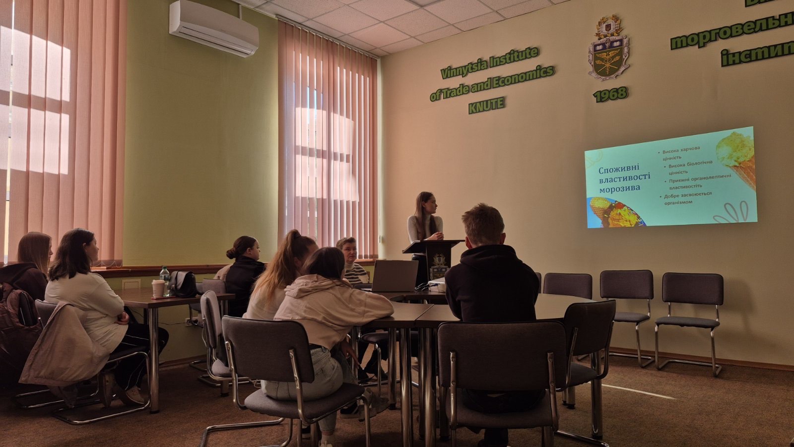 На засіданні гуртка, темою якого були «Дослідження технології виробництва морозива», здобувачі вищої освіти продемонстрували високий рівень підготовки, представивши змістовні презентації, у яких висвітлили сучасні тенденції виробництва морозива, особливості підбору сировини, технологічні аспекти виробництва, обґрунтували актуальність такої продукції на ринку продуктів харчування. Особливу увагу було приділено питанням якості, безпечності та харчової цінності аналізованої продукції.