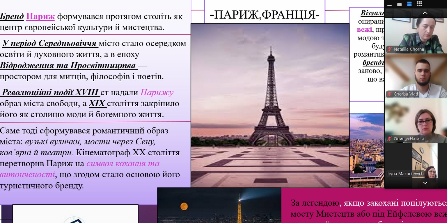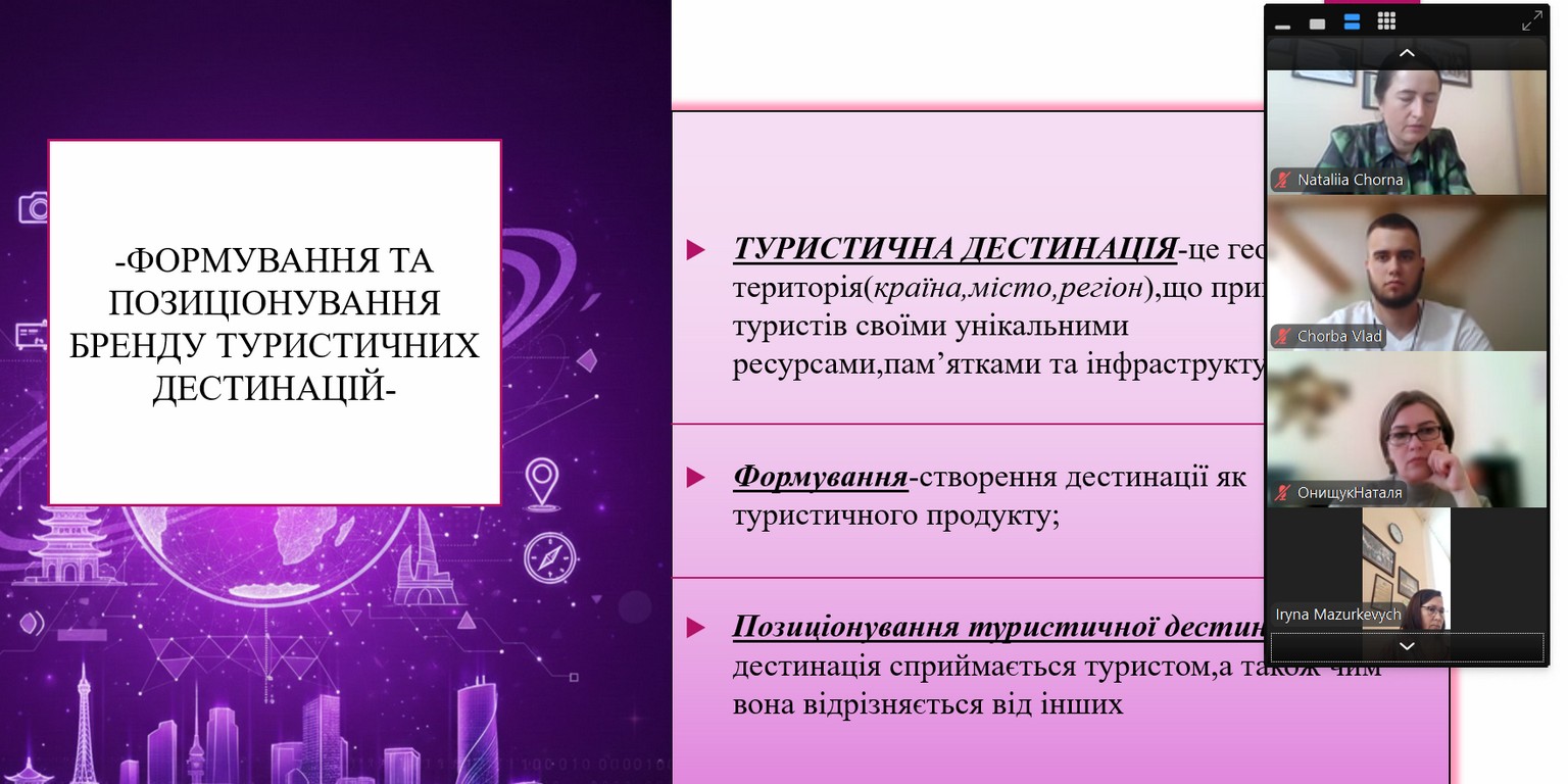 - Шпинь Валерія, здобувач вищої освіти ОС «бакалавр» ОП «Туризм і рекреація» групи ТР-31д з доповіддю на тему «Формування та позиціонування бренду туристичних дестинацій»;