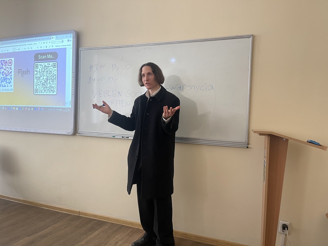 У межах проведення тижня обліково-фінансового факультету кафедра іноземної філології та перекладу провела панельну дискусію «Speak. Share. Inspire». Здобувачі факультету різних курсів та спеціальностей мали можливість поспілкуватися із носієм мови Майклом Вареницею, викладачем школи англійської мови FLASH, який поділився практичними знаннями та досвідом у сфері міжнародного бізнесу.