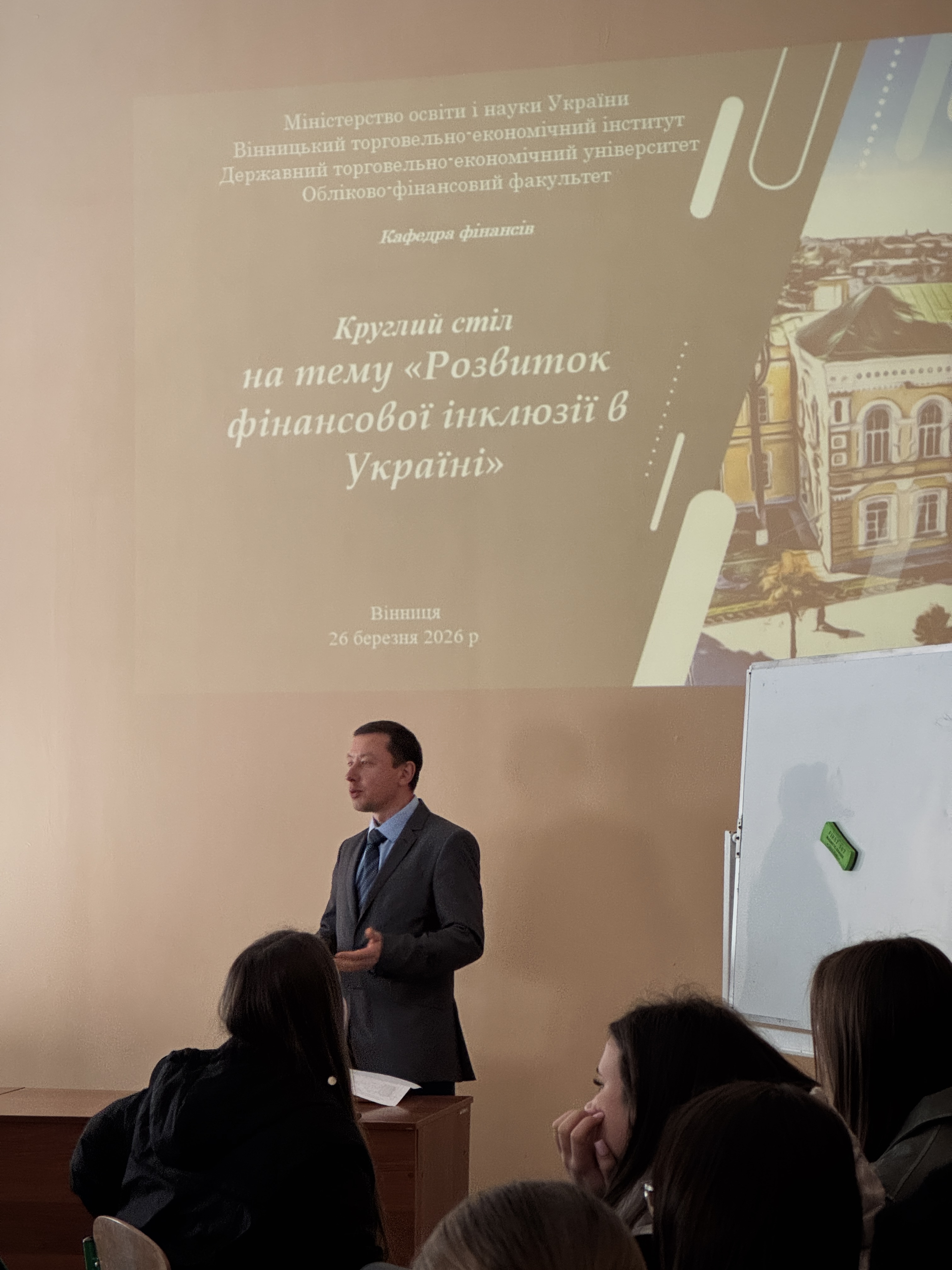 26 березня 2026 року у Вінницькому торговельно-економічному інституті ДТЕУ в рамках святкування тижня обліково-фінансового факультету відбувся круглий стіл на тему «Розвиток фінансової інклюзії в Україні», який об’єднав здобувачів бакалаврату та магістратури освітньої програми «Фінанси, банківська справа, страхування та фондовий ринок», а також здобувачів фахового молодшого бакалавра освітньої програми «Бізнес-технології та рекламна діяльність» Вінницького фахового коледжу будівництва, архітектури та дизайну КНУБА.