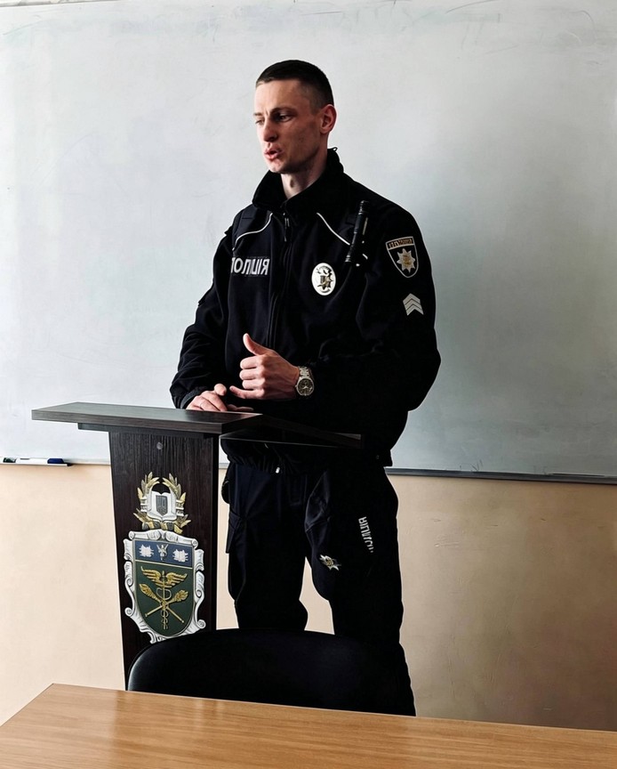 У ході лекції поліцейський розкрив ключові аспекти дотримання етичних стандартів у діяльності поліцейських, зокрема принципи законності, неупередженості, професійної відповідальності, а також важливість етичної комунікації з громадянами.