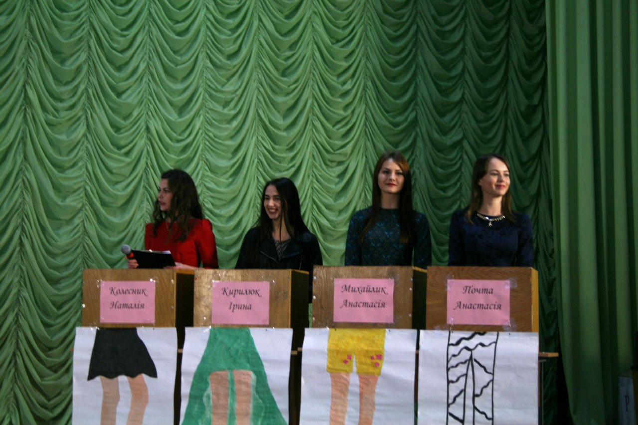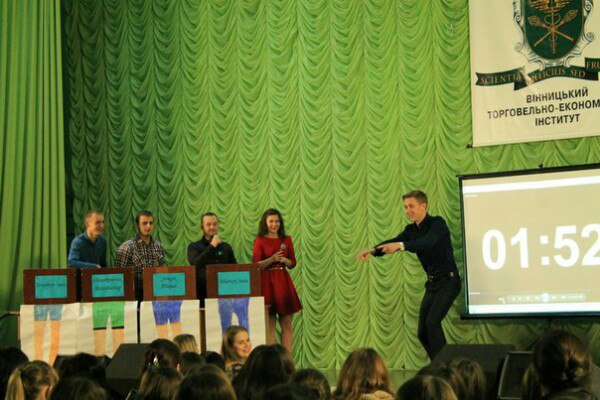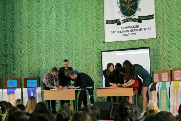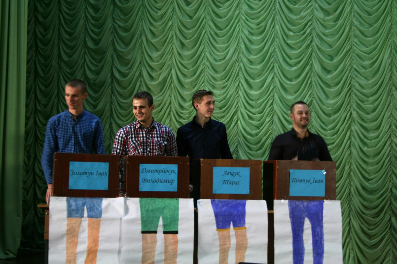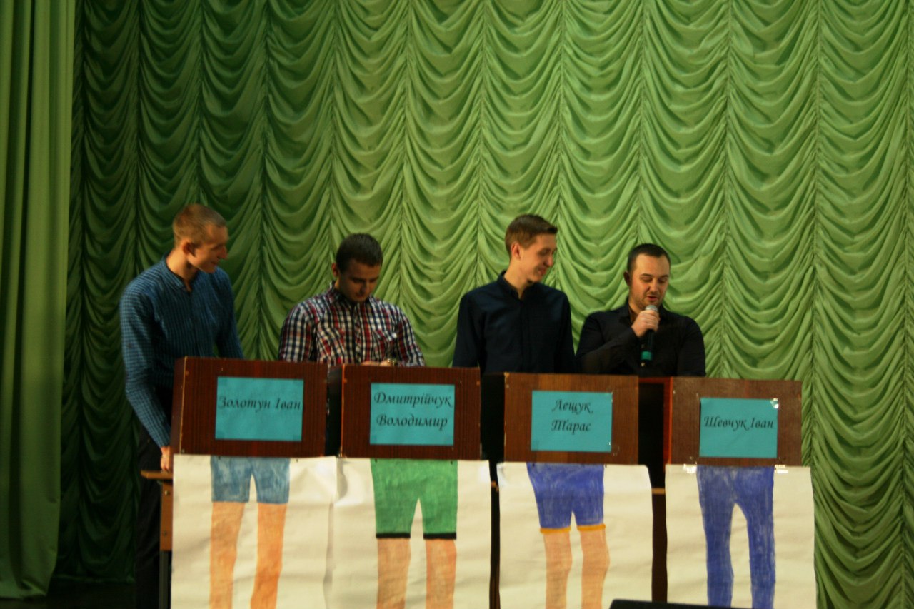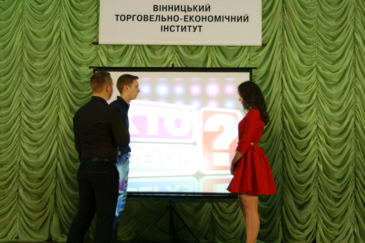 До складу команди ЧОЛОВІКІВ увійшли: найкращий ведучий та соліст тріо «Слов’янські козаки» Іван Шевчук, голова спортивного сектору РСС ОФФ та староста групи ДФК-31д Тарас Лещук, спортсмен, активіст і просто «красунчик» Володимир Дмитрійчук та голова спортивного сектору РСС ВТЕІ Іван Золотун. Команду ДІВЧАТ представляли: найкраща ведуча Наталія Колеснік, староста групи ДФ-22д Ірина Кирилюк, учасниця конкурсу краси та таланту «Міс Торговельно-економічного – 2015» Михайлик Анастасія та голова науково-навчального сектору РСС ОФФ Почта Анастасія. Верховним суддею був – голова студентського профкому ОФФ Олександр Чернега. Приємна атмосфера та хороший настрій панували в залі. Глядачі активно підтримували команди. Зрештою, перемогу здобула команда ЧОЛОВІКІВ, а команда ДІВЧАТ була змушена «кукурікати» на сцені. Рада студентського самоврядування обліково-фінансового факультету обіцяє провести гру-реванш "Хто зверху?". І можливо, в наступній грі ДІВЧАТА отримають таки перемогу !