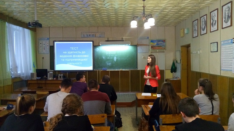 Під час тренінгу учням було проведено міні-лекцію «Моя професія – фінансист», тестування на здатність ведення фінансової та підприємницької діяльності, психологічний практикум. Учні проявили свої творчі вміння та навички під час виконання завдання «Намалюй емблему фінансиста» та брали активну участь у тренінгу. По закінченню усі учасники були нагороджені подяками.