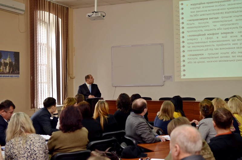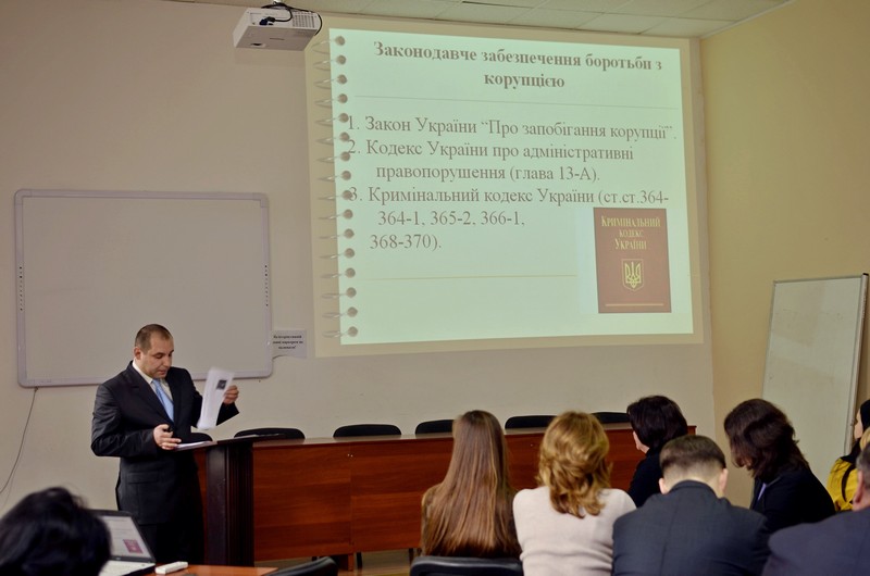 7 грудня 2015 року для професорсько-викладацького складу та керівників підрозділів в рамках Всеукраїнського тижня права (07.12.2015 – 11.12.2015) була проведена бесіда з питань запобігання та виявлення корупції у ВНЗ. Бесіду проводив доцент кафедри психології, соціології та права к.ю.н. Панькевич В.М. Доповідач ознайомив із законодавчим забезпеченням боротьби з корупцією та новелами антикорупційного законодавства України.