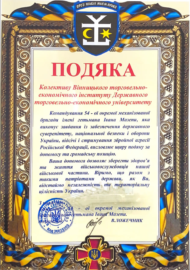 Командування 54-ої окремої механізованої бригади імені гетьмана Івана Мазепи висловили подяку колективу Вінницького торговельно-економічного інституту ДТЕУ за допомогу та громадську позицію.