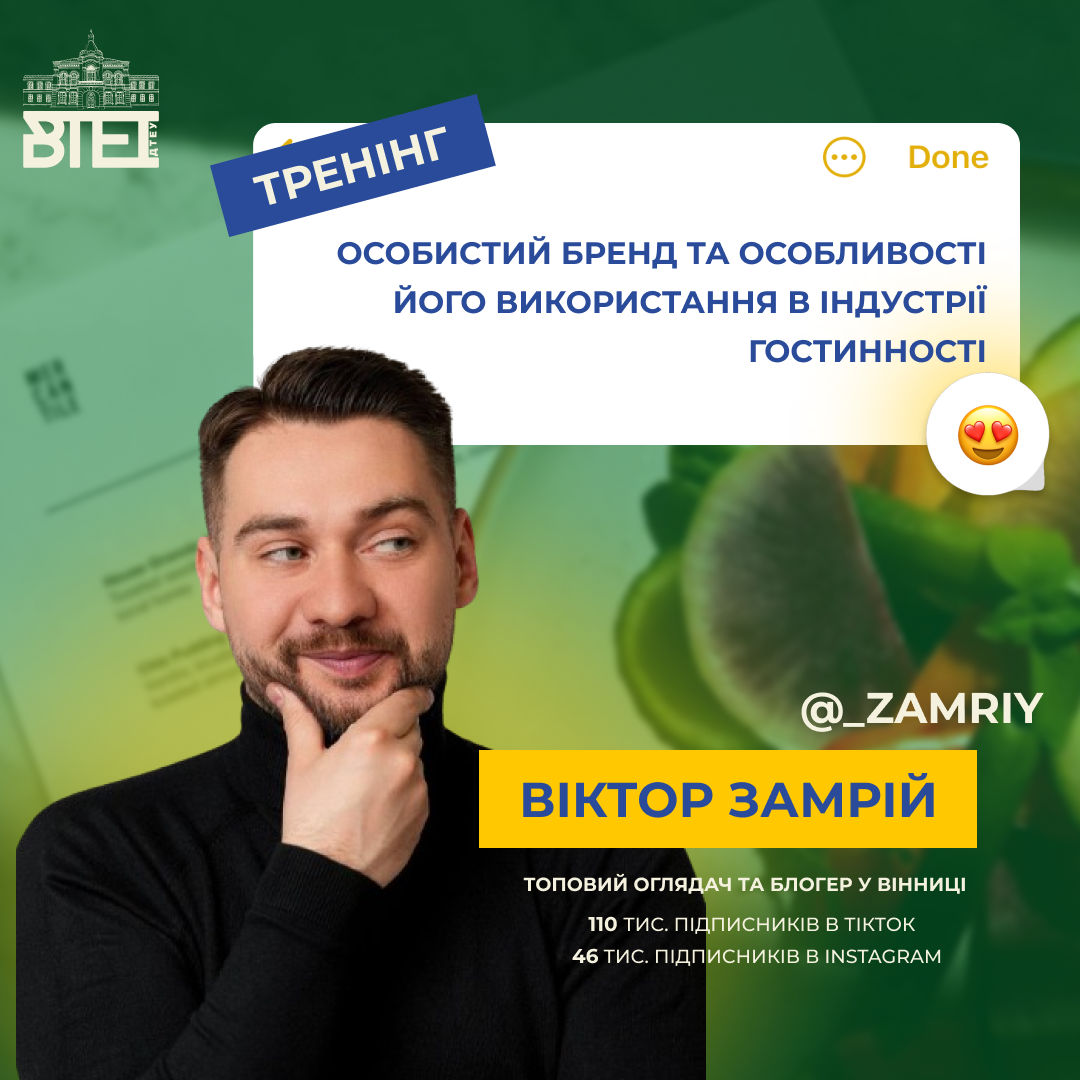9 квітня 2024 року для здобувачів вищої освіти за спеціальностями 075 «Маркетинг», 181 «Харчові технології», 241 «Готельно-ресторанна справа», 242 «Туризм»/«Туризм і рекреація» ОС «бакалавр», «магістр» було проведено тренінг від Віктора Замрія на тему: «Особистий бренд та особливості його використання в індустрії гостинності».