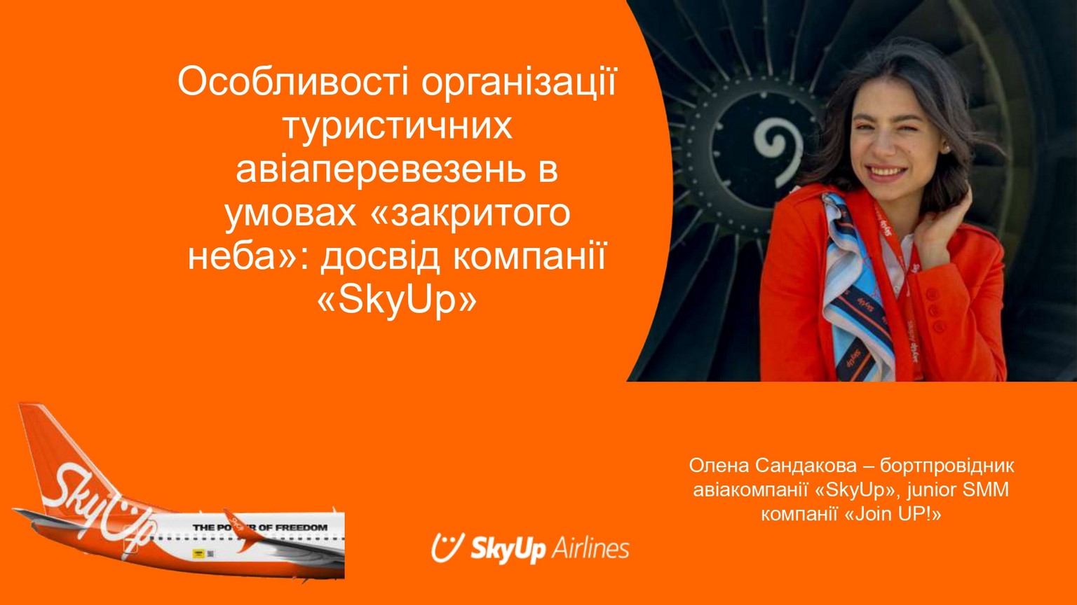 21 березня 2024 року для здобувачів вищої освіти за спеціальностями 242 «Туризм»/«Туризм і рекреація», 241 «Готельно-ресторанна справа» ОС «бакалавр», «магістр» у рамках вивчення освітніх компонентів «Організація туризму», «Міжнародний туризм» проведено гостьову лекцію на тему «Особливості організації туристичних авіаперевезень в умовах «закритого неба»: досвід компанії «SkyUp!». У якості запрошеного лектора виступила Олена Сандакова, випускниця освітньої програми «Туризм» ОС «бакалавр», а наразі – бортпровідник авіакомпанії «SkyUp», junior SMM компанії «Join UP!».