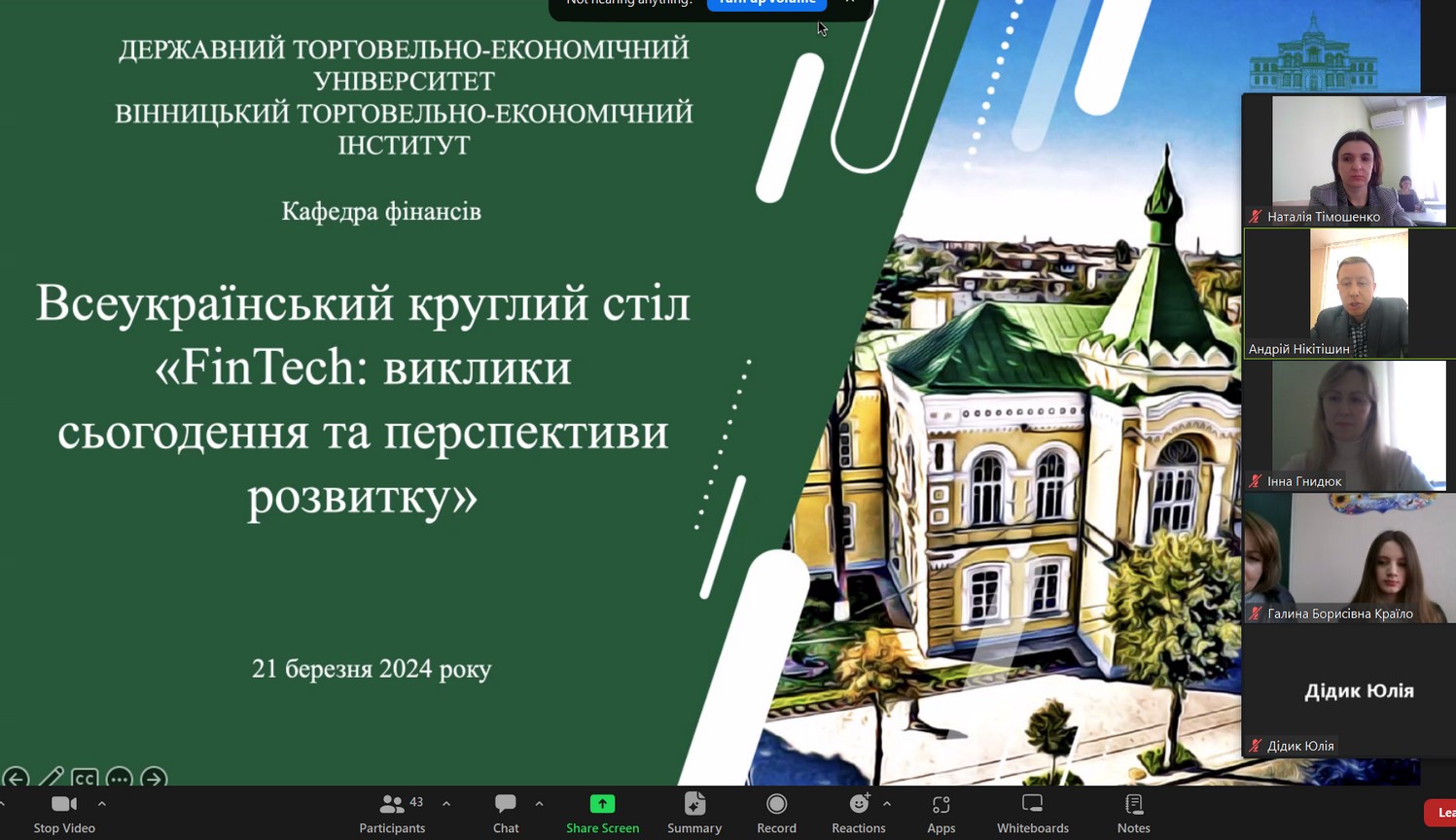 21 березня 2024 року в рамках XІІ Фестивалю студентської науки науково-педагогічними працівниками кафедри фінансів ВТЕІ ДТЕУ проведено Всеукраїнський круглий стіл "FinTech: виклики сьогодення та перспективи розвитку". Дискусійна платформа була присвячена сучасним фінансовим технологіям, що стають невід'ємною частиною фінансової системи України та світу. Учасниками наукового заходу стали здобувачі вищої освіти зі спеціальності 072 "Фінанси, банківська справа та страхування" та "Фінанси, банківська справа, страхування та фондовий ринок" Поліського національного університету, Калинівського технологічного фахового коледжу та Вінницького торговельно-економічного інституту ДТЕУ.