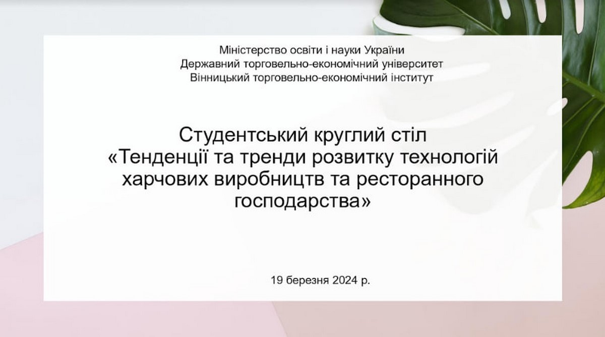 19 березня 2024 року кафедрою туризму та готельно-ресторанної справи проведено студентський круглий стіл на тему «Тенденції та тренди розвитку технологій харчових виробництв та ресторанного господарства», участь у якому взяли здобувачі вищої освіти, які навчаються за спеціальностями 181 «Харчові технології», 241 «Готельно-ресторанна справа».