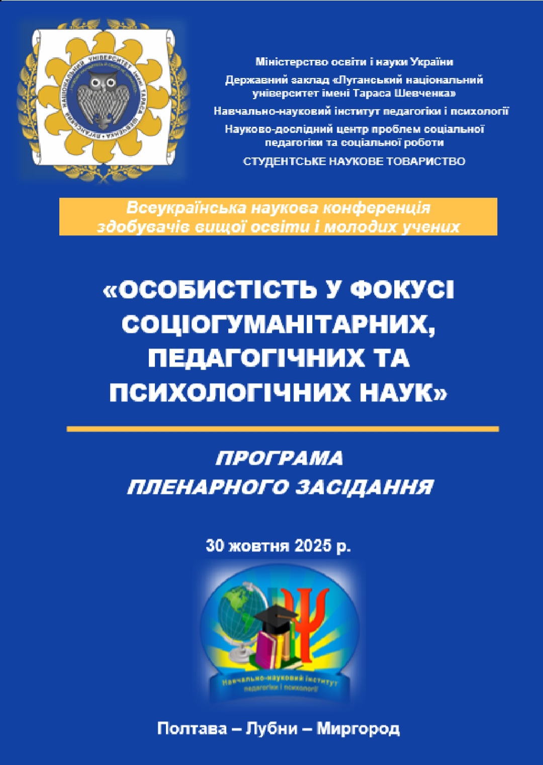 30-31 жовтня 2025 року в Державному закладі «Луганський національний університет імені Тараса Шевченка» відбулась Всеукраїнська науково-практична конференція «Особистість у фокусі соціогуманітарних, педагогічних та психологічних наук». Метою заходу стала популяризація наукових здобутків молодих учених України у галузях педагогіки, психології та соціогуманітарних наук, а також налагодження міжуніверситетської співпраці серед здобувачів вищої освіти з різних регіонів країни.