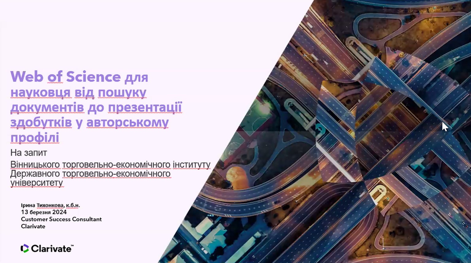 13 березня 2024 р. проведено вебінар на тему: «Web of Science для науковця від пошуку документів до презентації здобутків у авторському профілі» від компанії Clarivate. Захід проведено на запит Вінницького торговельно-економічного інституту ДТЕУ.