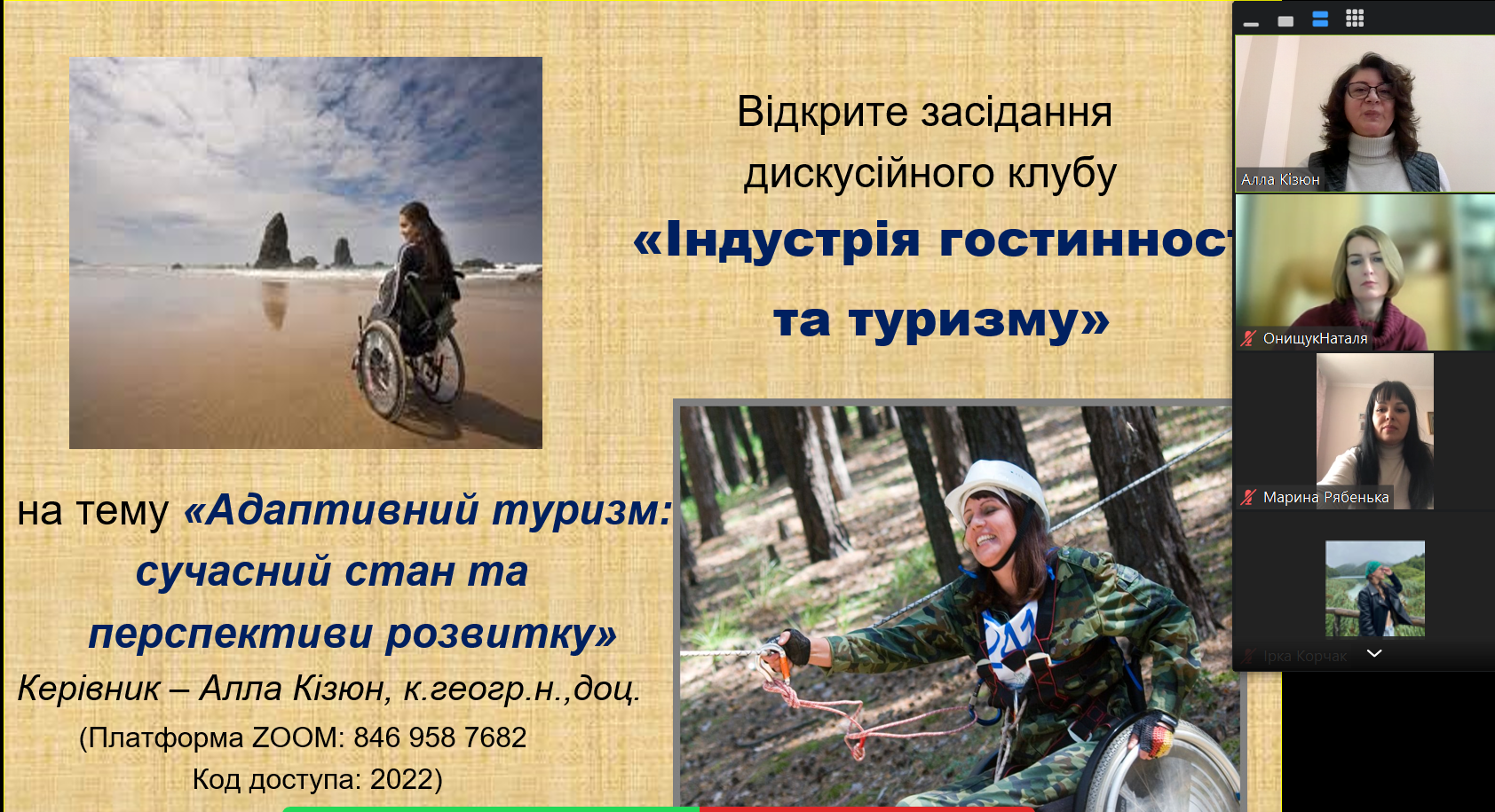 12 березня 2024 року в рамках ХІІ Фестивалю студентської науки кафедрою туризму та готельно-ресторанної справи було проведено відкрите засідання дискусійного клубу «Індустрія гостинності та туризму» (керівник – доц. Кізюн А.Г.) на тему «Адаптивний туризм: сучасний стан та перспективи розвитку», участь в якому взяли здобувачі вищої освіти за спеціальностями 241 «Готельно-ресторанна справа», 242 «Туризм» ОС «бакалавр», «магістр».
