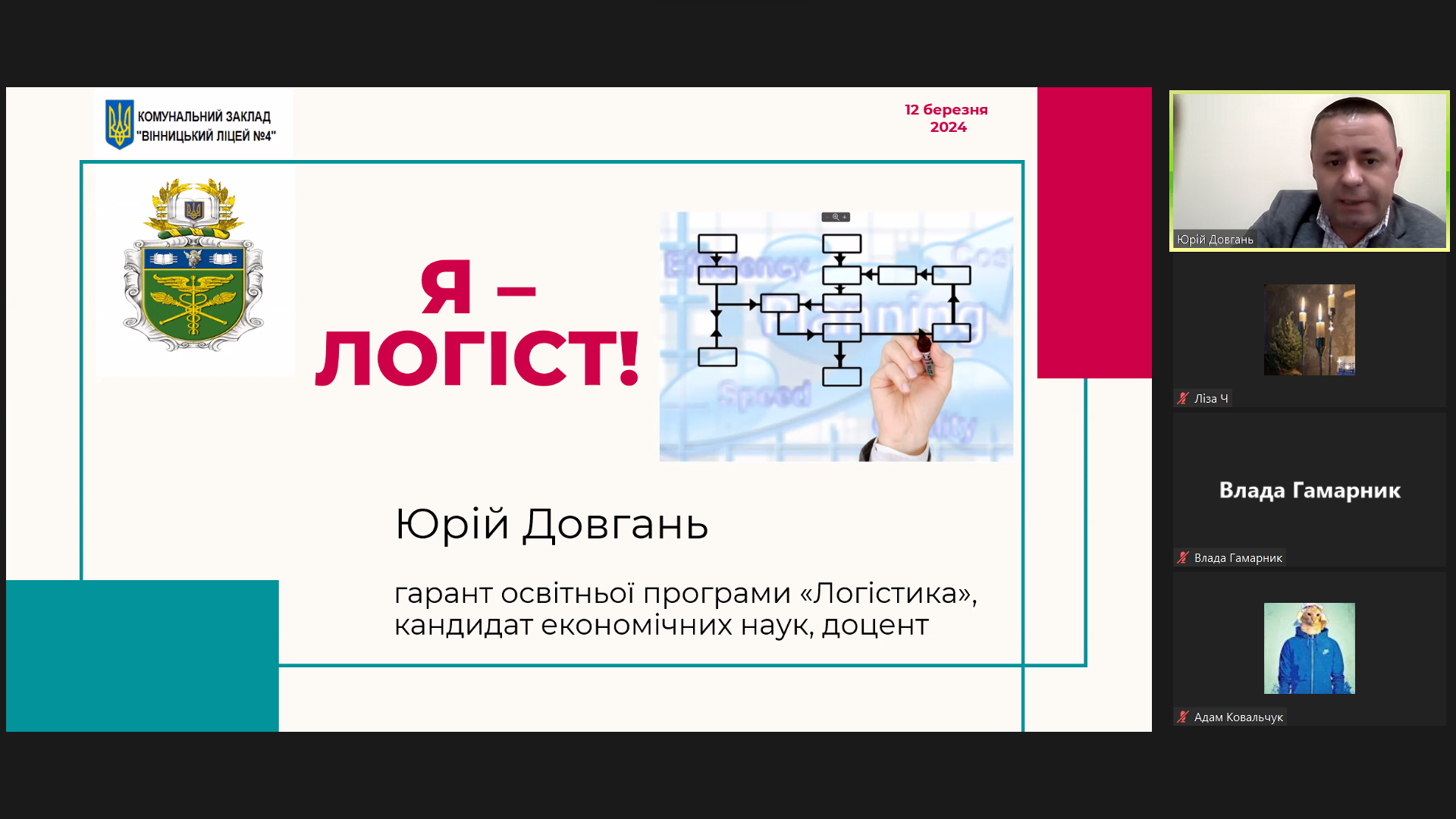 12 березня 2024 року на платформі Zoom, в межах дії Меморандуму про співпрацю між закладами освіти, відбулась лекція-презентація «Я - логіст» для учнів 11-В класу комунального закладу «Вінницький ліцей №4», які вивчають курс за вибором «Соціальне шкільне підприємство».