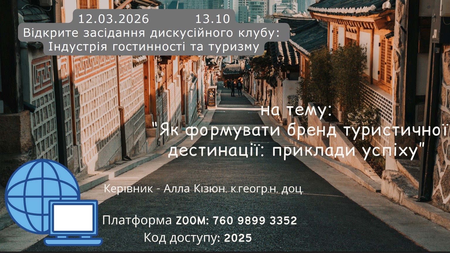 12 березня 2026 року відбулось відкрите засідання дискусійного клубу ««Індустрія туризму та гостинності» на тему «Як формувати бренд туристичної дестинації: приклади успіху» (на платформі ZOOM).