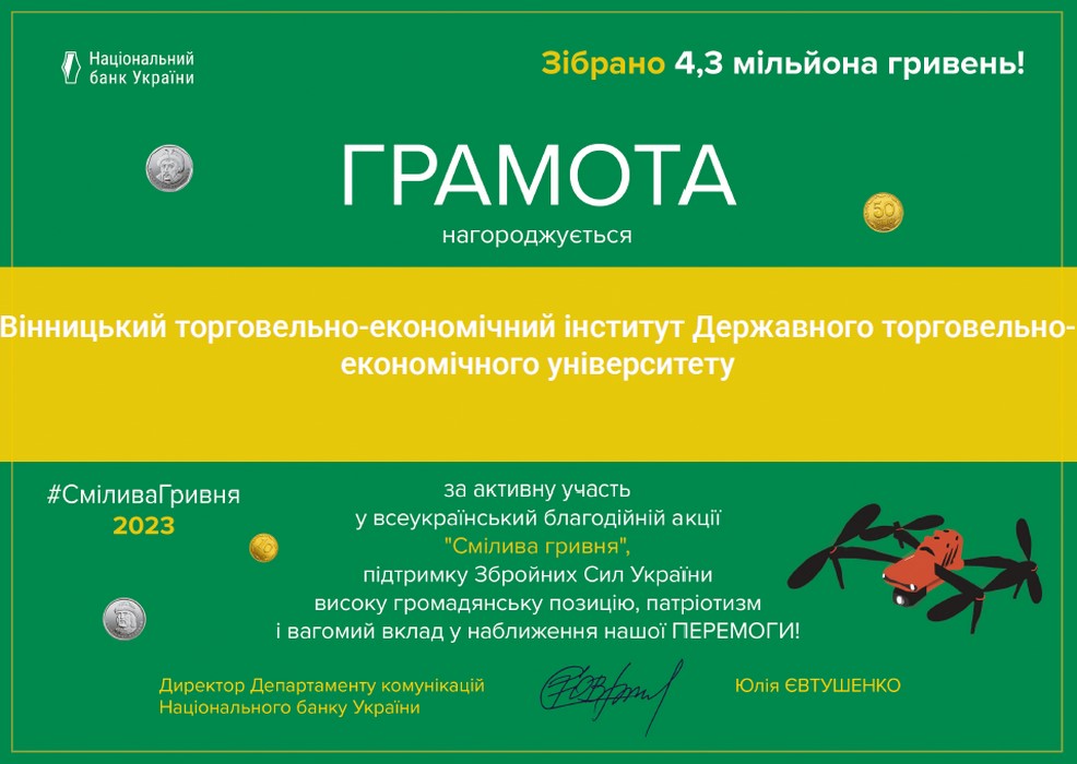 Вінницький торговельно-економічний інститут ДТЕУ долучився до Всеукраїнської акції «Смілива гривня», що була ініційована Національним банком України. Ця акція – це благодійна ініціатива, мета якої об'єднати зусилля українців та зібрати кошти для допомоги українській армії.