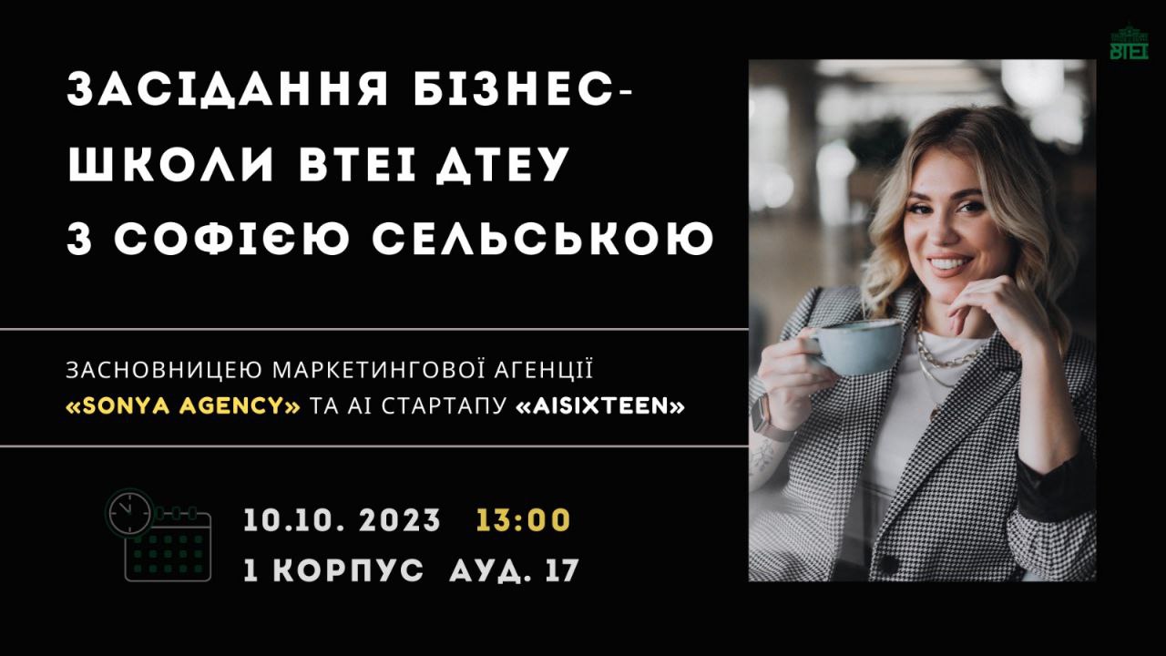 10 жовтня 2022 року відбулася зустріч слухачів Бізнес-школи ВТЕІ ДТЕУ з Софією Сельською, засновницею маркетингової агенції «Sonya Agency» та AI стартапу «AISixteen», маркетологом з досвідом роботи в сфері маркетингу, рекламних та ПР-технологій.